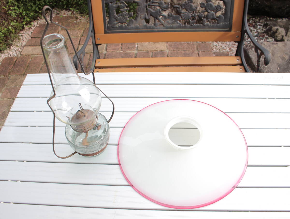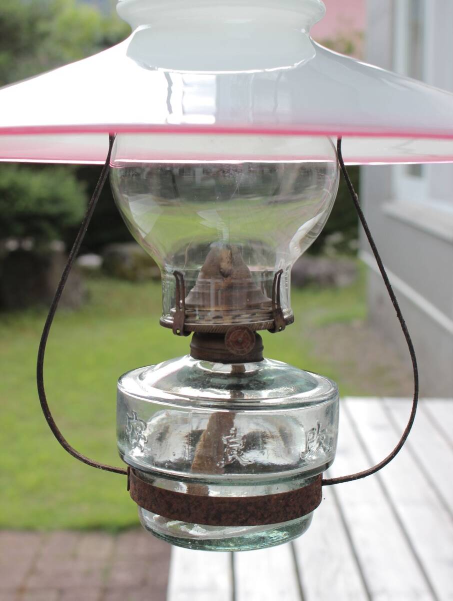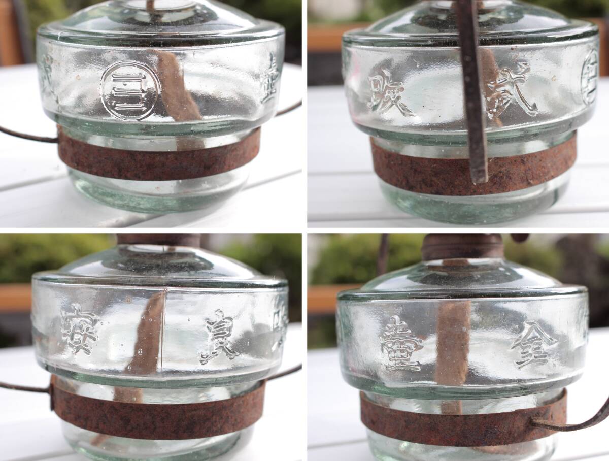 アンティーク オイルランプ 吊下げランプ 吊りランプ 乳白 縁赤 ガラス 電笠 〇ヨ式改良安全壷 エンボス 刻印有り