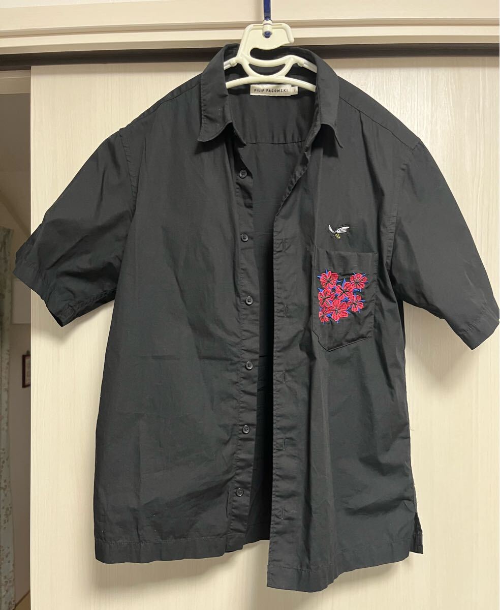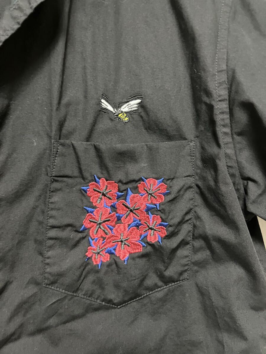 ジーユー gu ブラック オープンカラー シャツ 半袖 刺繍 半袖シャツ メンズSサイズ 花 蜂 ユニクロ 着丈69 身幅56