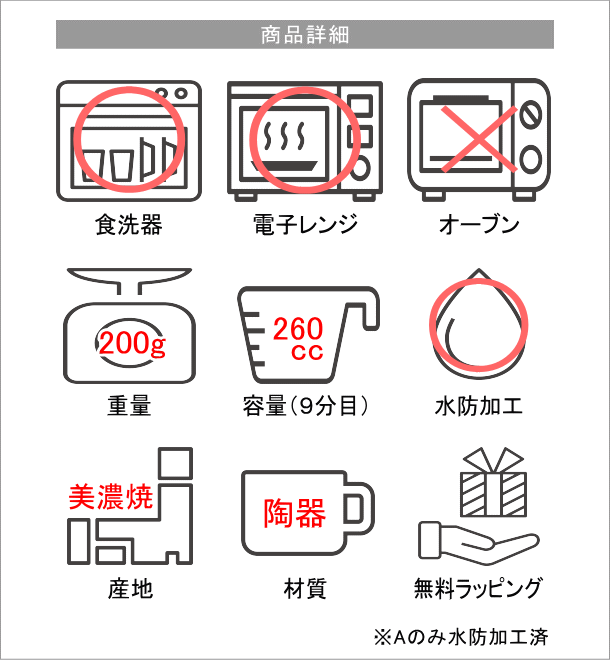 | こちらのページでは【Aカラー】のみの販売です 土を削って模様を付け 違う色合いの化粧土を埋め込んだ 象がん技法のマグカップ ”松葉紋様”が施されていて 松葉は枯れ落ちても 2本が一対となっていることから 古くから縁起が良いとされていて お祝いにもオススメです 触れた指先から 土の温かみが伝わるような 素朴な風合いのマグカップです 商品名 : 松葉象がんマグ 商品番号 : kyt9173 全体のサイズ(cm) : 口径9.7×高さ8.3 容量(9分目) : 260cc 重量 : 200g 材質 : 陶器 使用方法 : 電子レンジ)〇 食洗機)〇 オーブン)× 生産国 : 日本(美濃) ※陶器の裏面は多少ざらざらとしている為、テーブルなどでの擦り傷にご注意ください -陶器(土物)の特性とお願い- 土物は同じ技法、同じ窯で焼成しても土や釉薬に含まれる天然鉱物などの影響や天候で焼き上がりは微妙に異なります。工業製品のように同一の物になる事はありません。手作りの不均一性、窯変、釉薬の細かいヒビ(貫入)や垂れ等は、製造元より土物の特性として良品の扱いとなります。ご理解頂きお買い求めくださいますようお願い申し上げます |