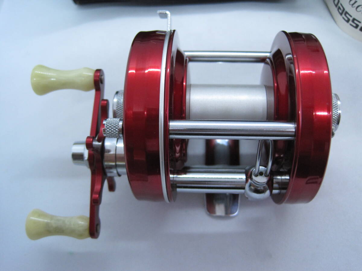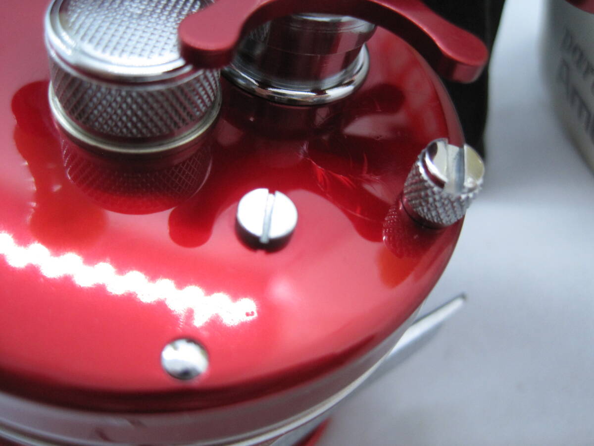 - 赤のアルマイト塗装されたサイドプレートとフレーム、ハンドルはアルミ製で、スプールもアルミ製です。めっきされたフートやピラー、その他のめっきパーツは真鍮製です。