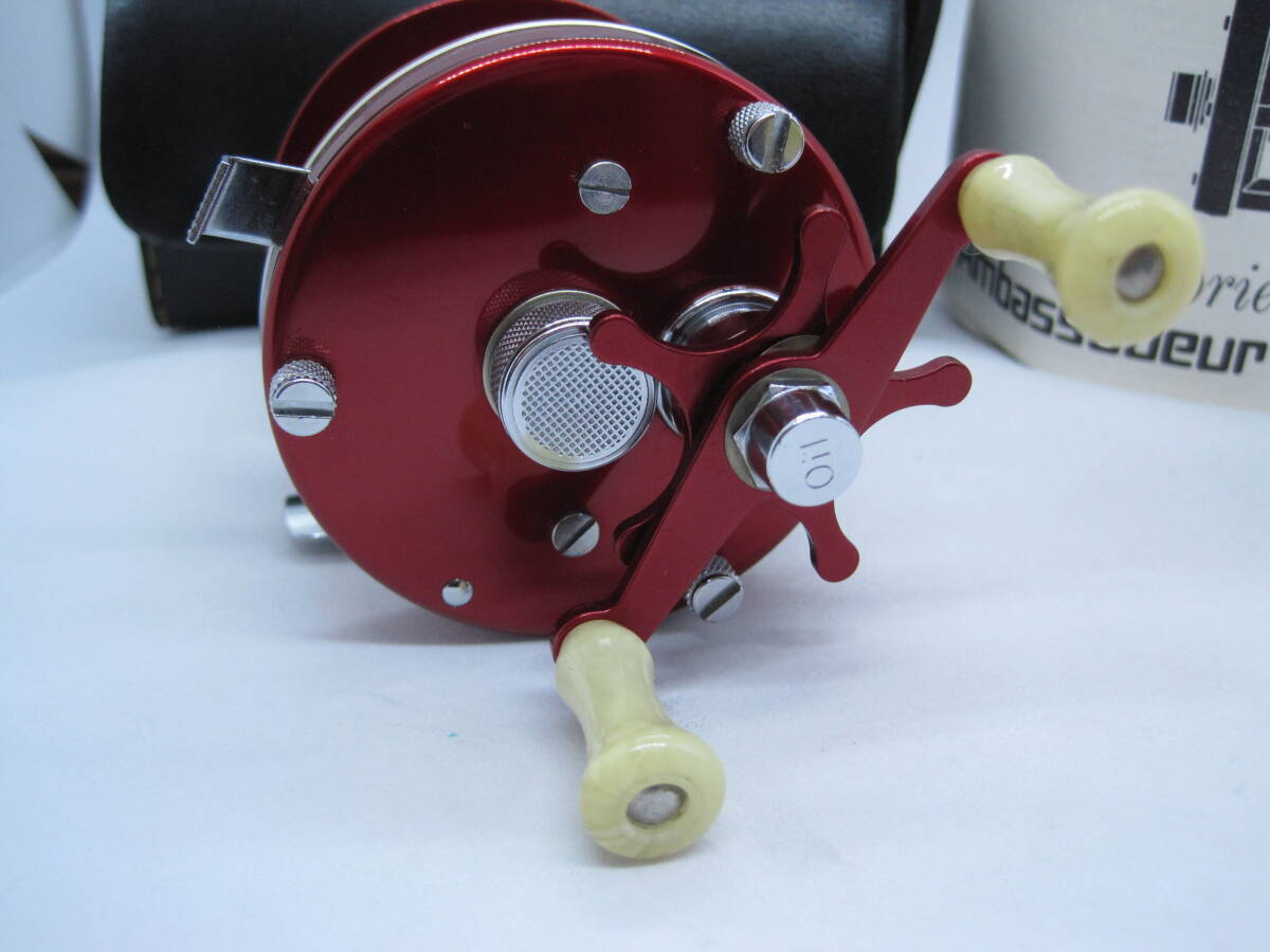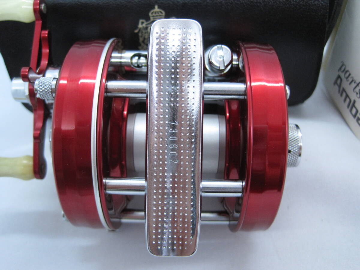 - 俗に“Big-A”と呼ばれるAmbassadeurの刻印、山型リム、マーブル調デザインのダブルスモールノブハンドル、ブロンズベアリングのスプール軸受け、ノーマルギヤ比、5本丸爪スモールドラグ、シルバーの太軸スプール等が特徴です。