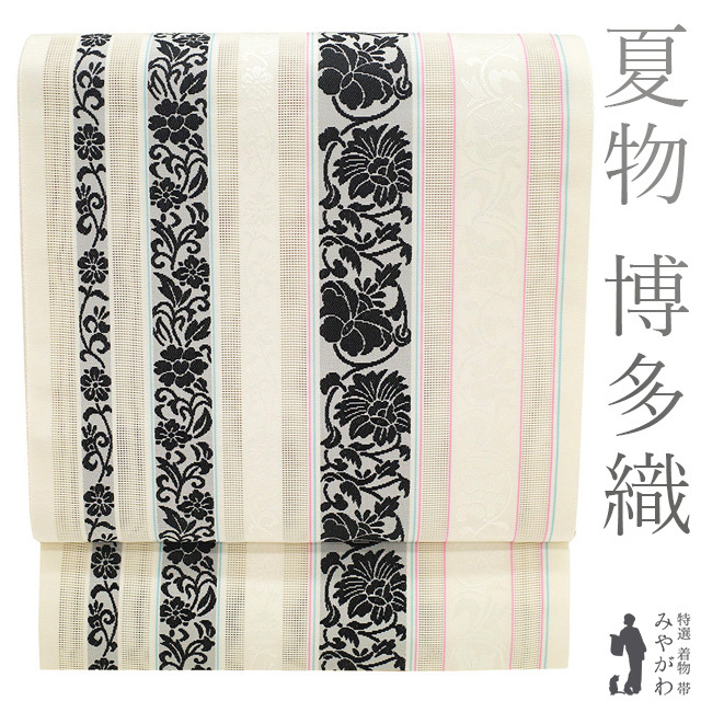 夏物 名古屋帯 未使用 正絹 本場筑前博多織 紗 全通 博多織 結女彩 オフホワイト 花唐草 カジュアル 新古品 仕立て上がり みやがわ sb54395
