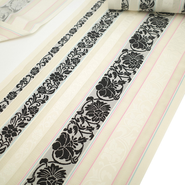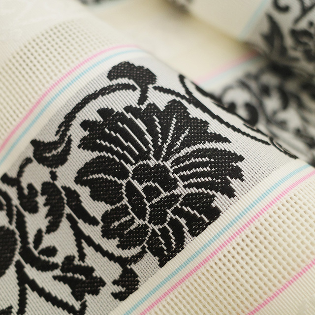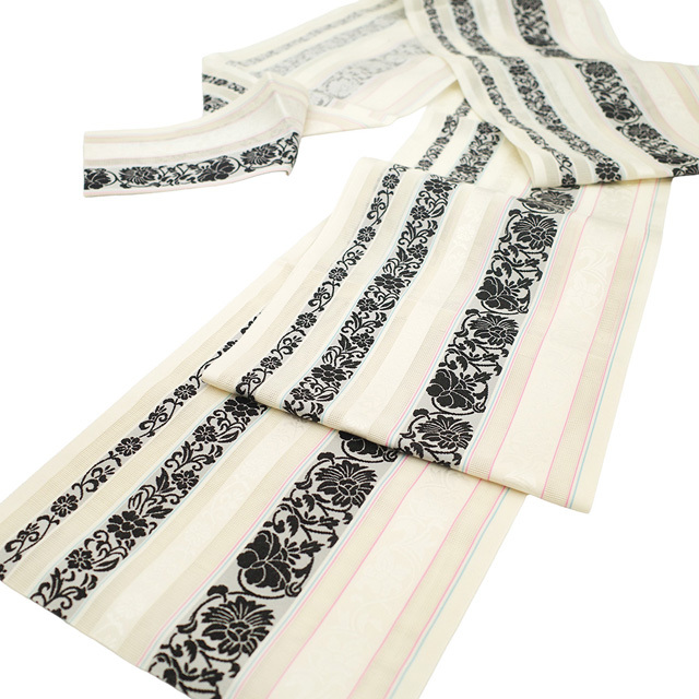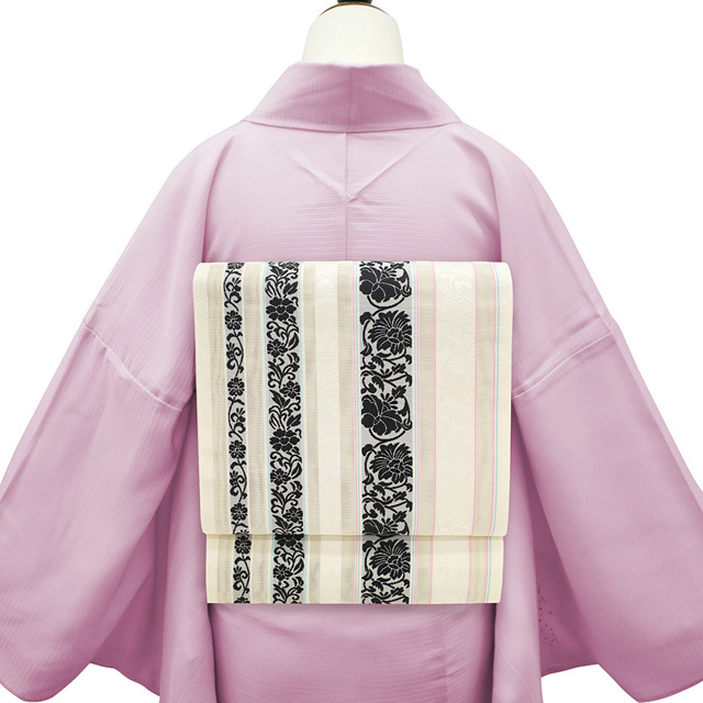 こちらのお品は オフホワイト色地にグレー・ピンク・水色の縞に黒で花唐草 が織り出されております。