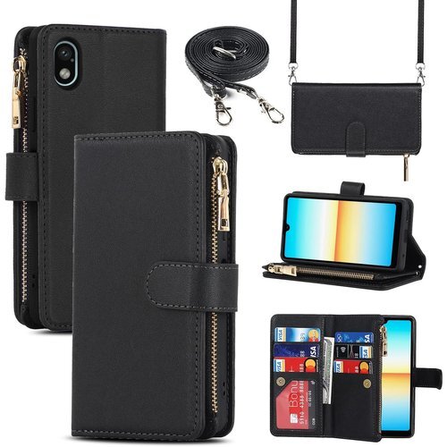 Pelanty for Xperia Ace III 縄掛けケース手帳型 SO-53C SOG08 携帯カバー 肩掛け斜めがけ ショルダー 合成皮革+TPU マグネット Sony Xperia Ace III 財布型カバー ICカード お札入れ小銭入れ大容量 収納ポケット スタンド機能 ソニー エクスペリアAceiii 3代 ストラップ付き 落下防止 耐衝撃 全面保護(肩縄付き-ブラック)