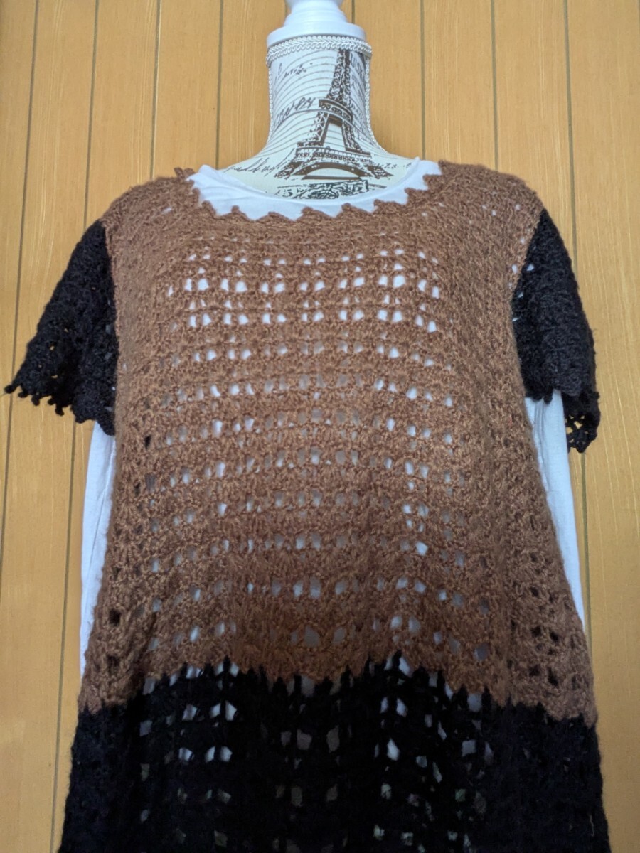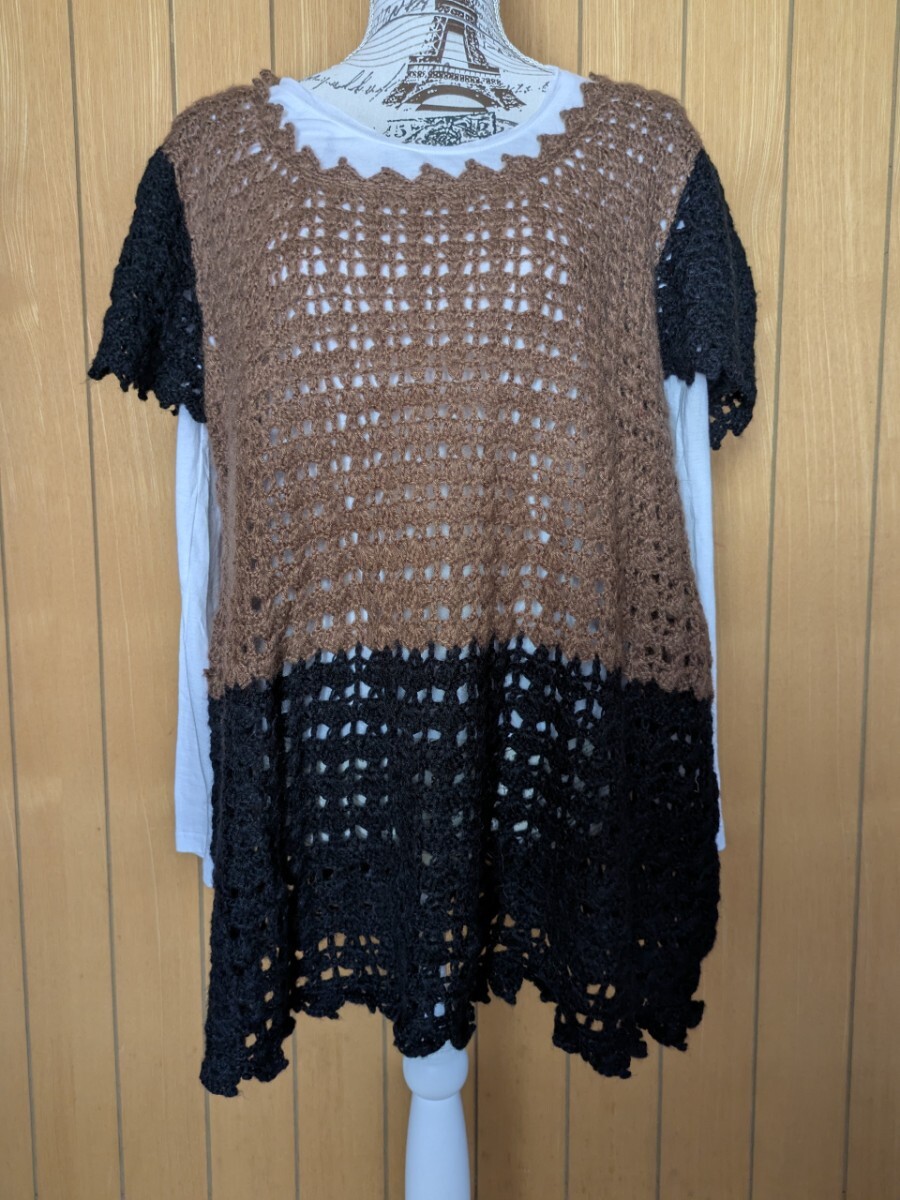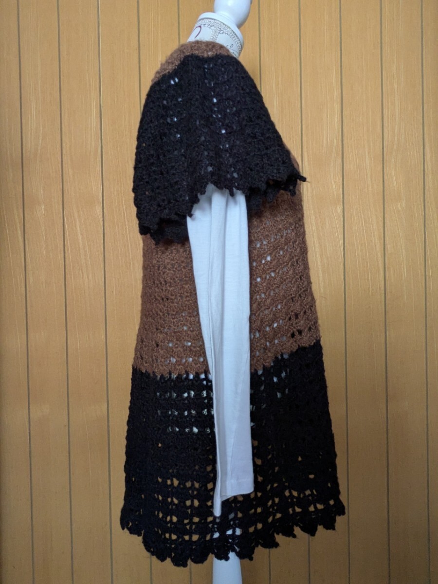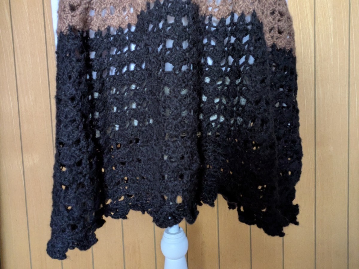 柔らかいモヘアで編んだ軽くて暖かいニットです。総模様編みで裾にむかっつゆるいAラインのデザインです。スカラップの縁取りも可愛らしいです。