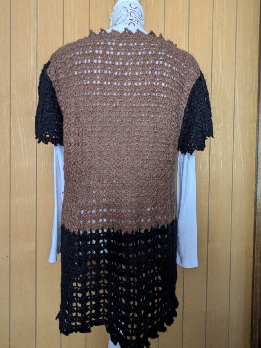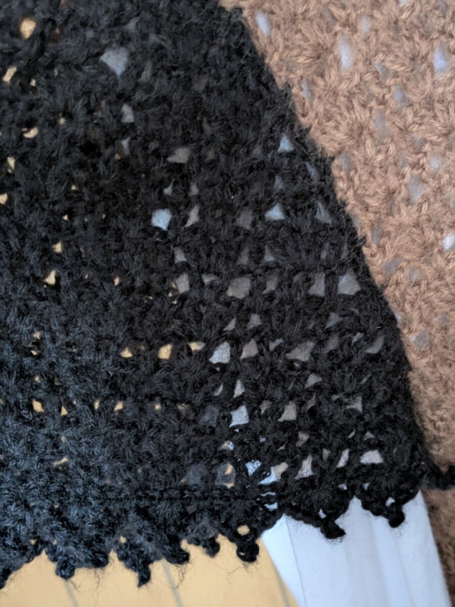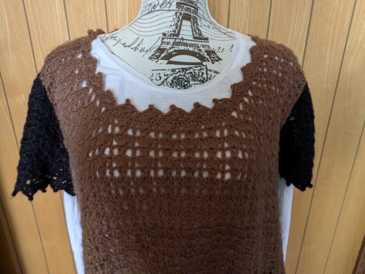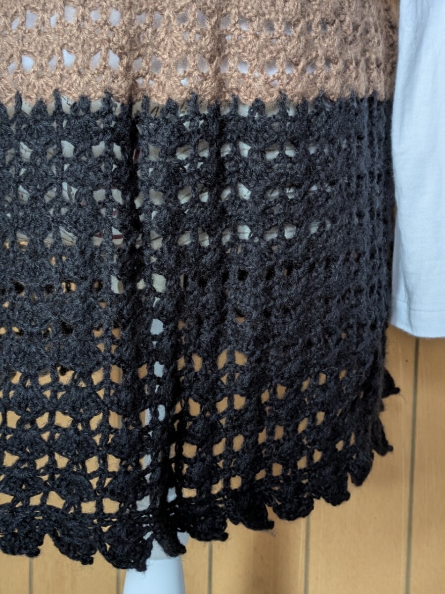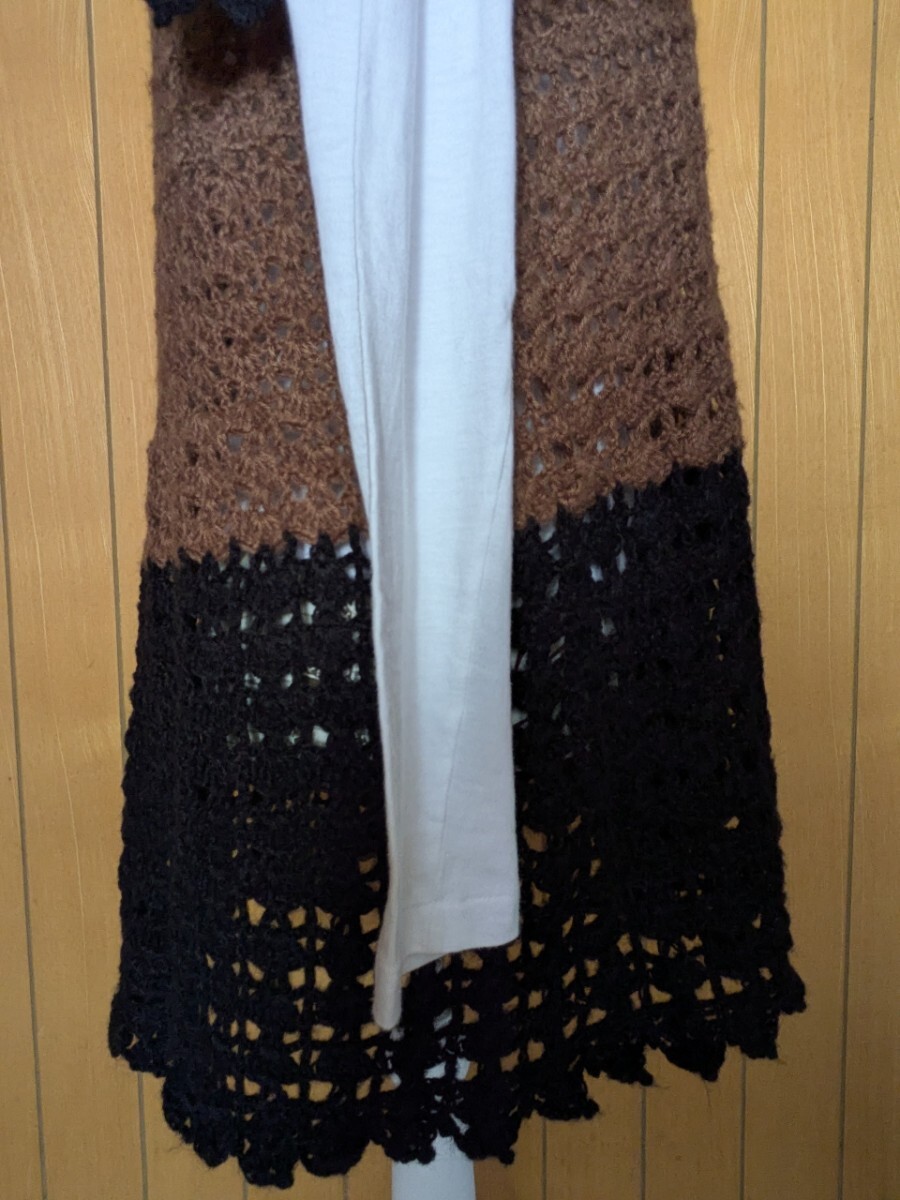 柔らかいモヘアで編んだ軽くて暖かいニットです。総模様編みで裾にむかっつゆるいAラインのデザインです。スカラップの縁取りも可愛らしいです。