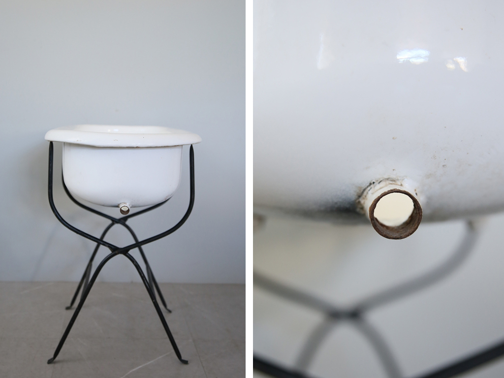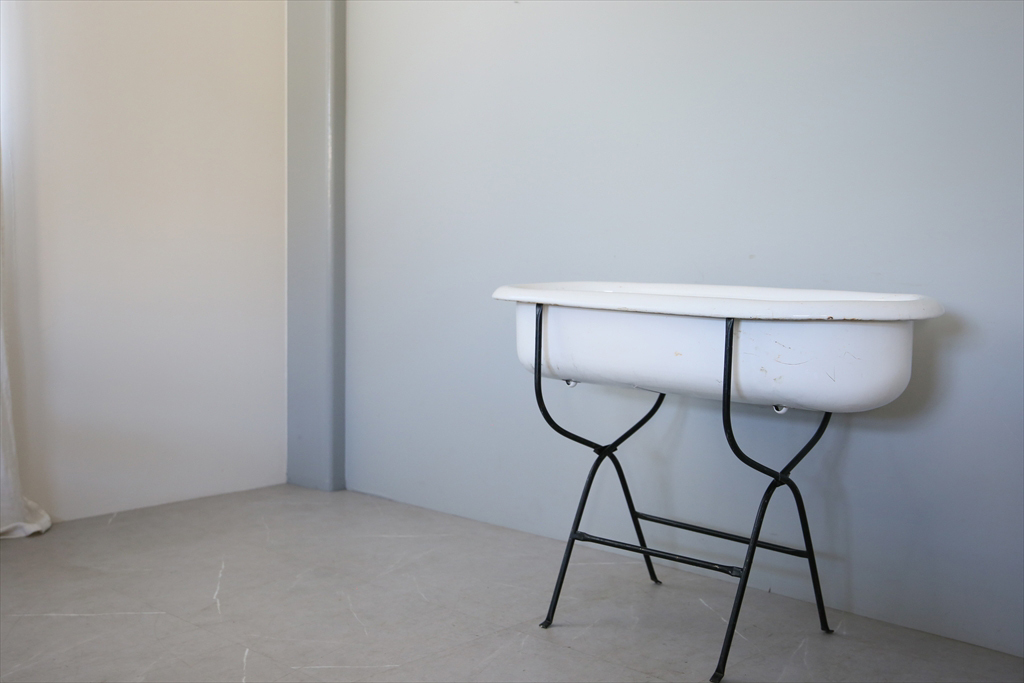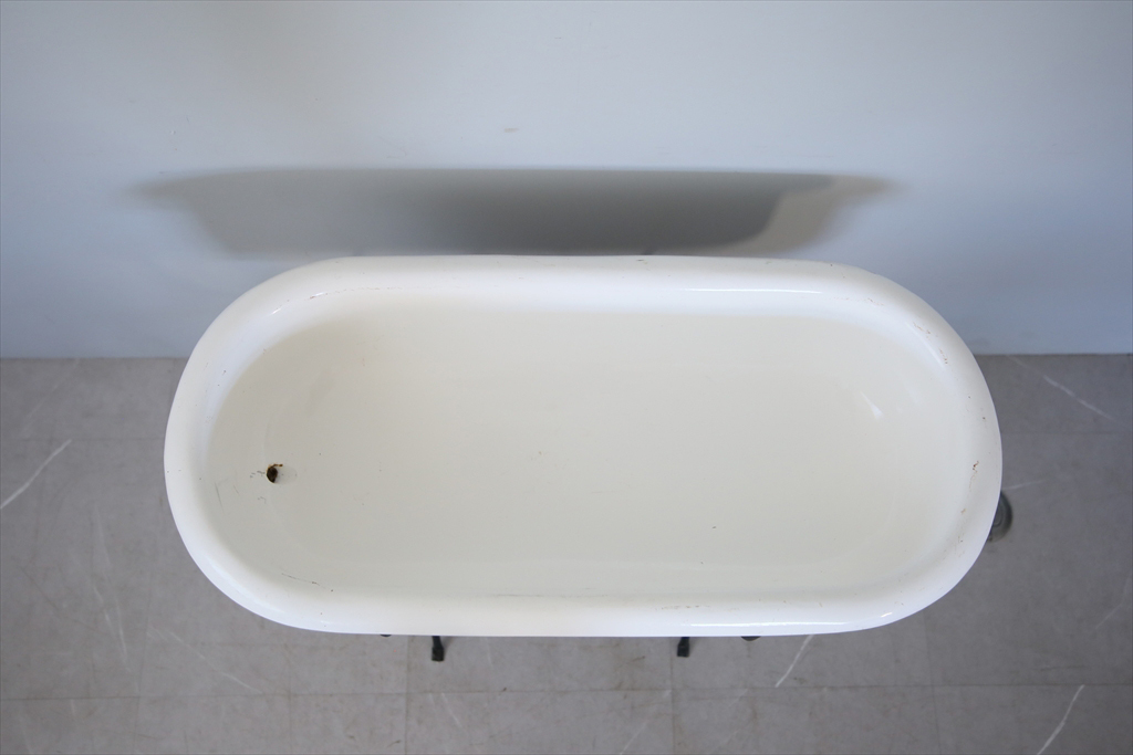 鉄製のホールディングスタンドに琺瑯(ホーロー)製のバスタブが乗っています。
