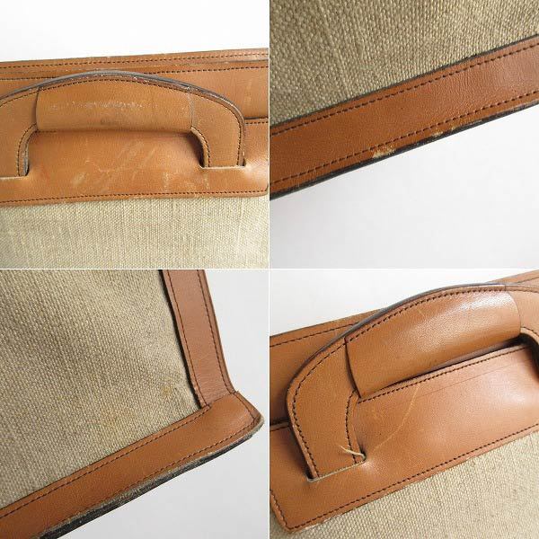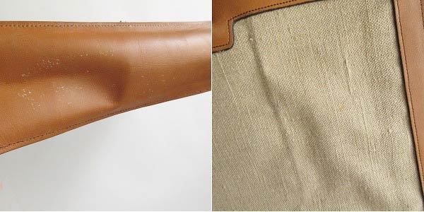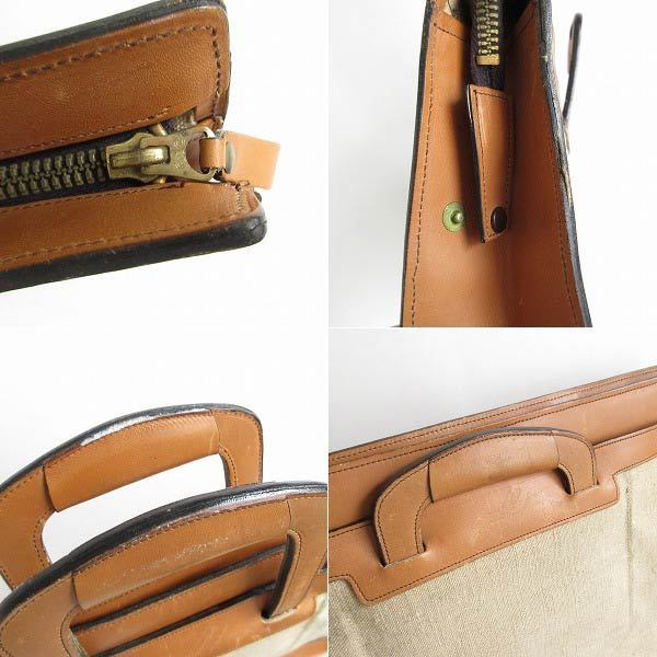 アメリカから買い付けたアイテムです。 レザー×リネン系キャンバス ブリーフケースです。 レザーハンドルは収納できる作り。 メインのジッパーポケットの他、両面にオープンポケットが付いた作りです。 織ムラを感じるリネン系キャンバスとレザーの異素材の切替が目を引く大人のバッグです。 C&Cジップ。 レザー部分に擦れ傷や細かな剥げ、ハンドルに白い付着汚れ、ファブリック部分にシミ汚れなど使用感はありますが、支障をきたすようなダメージはありませんのでまだまだご利用いただけます。 是非ご検討ください。 |