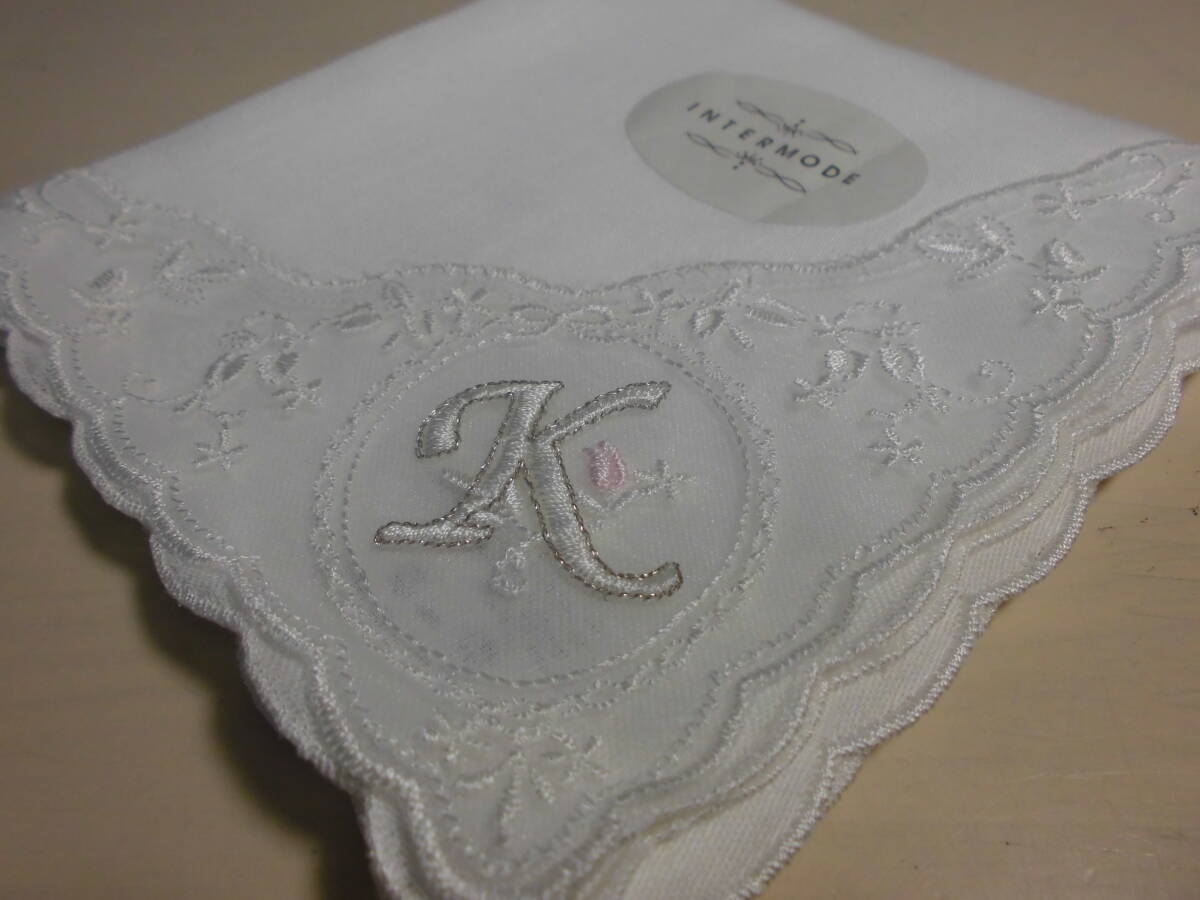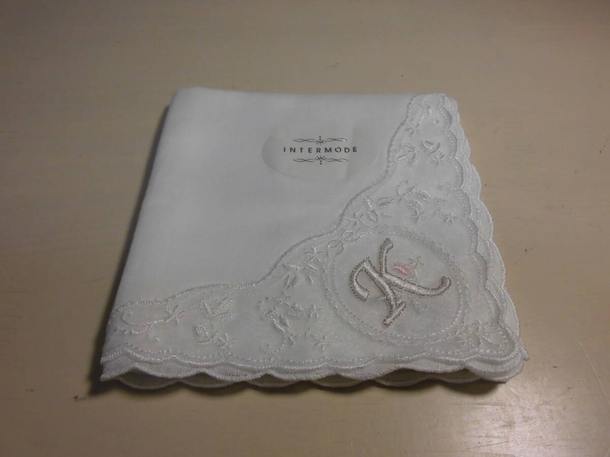 送料140円~ INTERMODE インターモード ハンカチ 純白 レース 花 刺繍 アルファベット K ホワイト の出品になります。