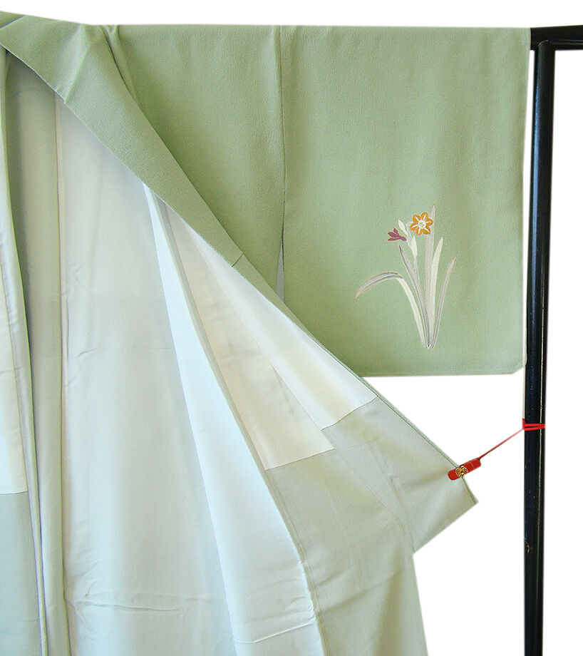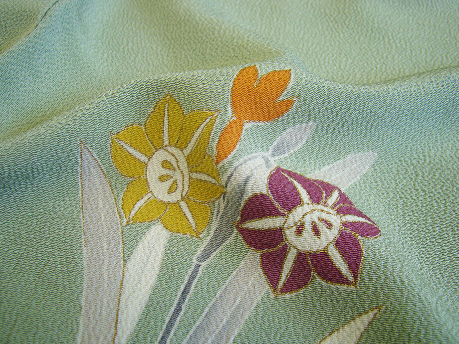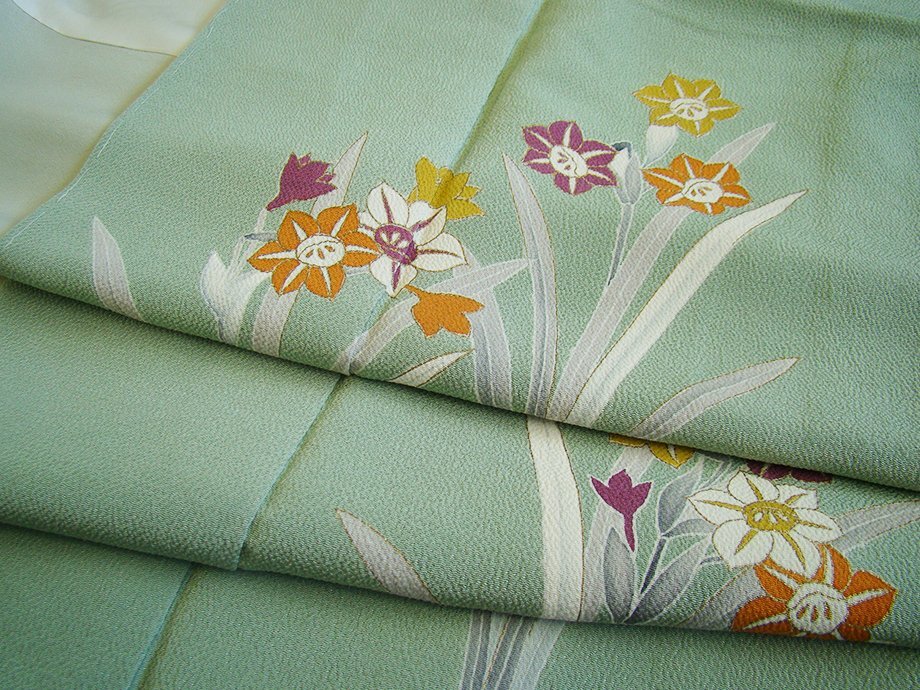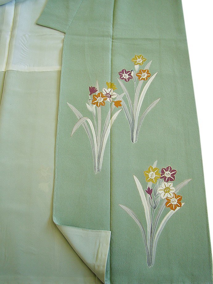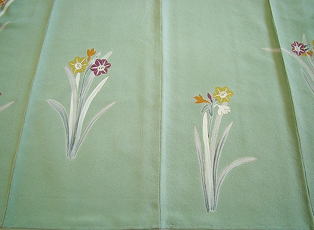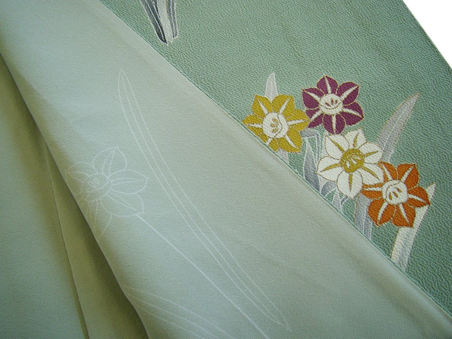 | 商品説明 | こちらのお品は「袷」ですので10月から5月までお召頂ければと思います。 とてもしなやかで柔らかな手触りの着心地良いぽってりとした上質な重めの極上ちりめん地の生地、 裏葉柳色地に灰、灰白、柿、からし、葡萄色等の花草柄の染柄に金彩加工仕立て、 気品に満ち溢れた彩りが正統派のお着物として一枚は欲しい逸品の素敵なお着物です。 八掛は薄いホワイトリリー色に柄入り(正絹)、裄長め、幅広い年代の方にお召頂けます。 |