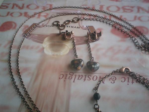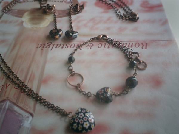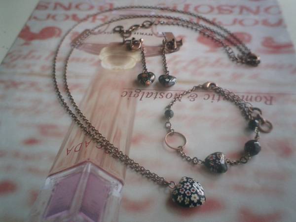女の子テイスト・・シリーズです♪シックな黒の小花柄・・オニキスと小花柄のベネチアビーズのネックレス、ブレスレット、イヤリングの3点セットです♪6ミリ、8ミリのランダムカットのオニキスやハートの小花柄のベネチアビーズを合わせて可憐な表情です♪ネックレスは繊細なチェーンに15ミリのハートのベネチアビーズを合わせました♪長さは70センチ+アジャスター15センチで最長85センチ位です♪ブレスレットは6ミリ、8ミリのランダムカットのオニキスに10ミリのベネチアビーズを合わせました♪長さは16センチ+アジャスター6センチで最長22センチ位です♪イヤリングは10ミリ位のハートのベネチアビーズです♪長さは全長5センチ位です♪ピアスにも変更出来ます♪それぞれ単品でも出品しています♪シンプルで飽きのこないいつまでも着けられるデザインを考えて作りました!ハンドメイドをご理解頂いてノークレーム、ノーリターンでお願いします