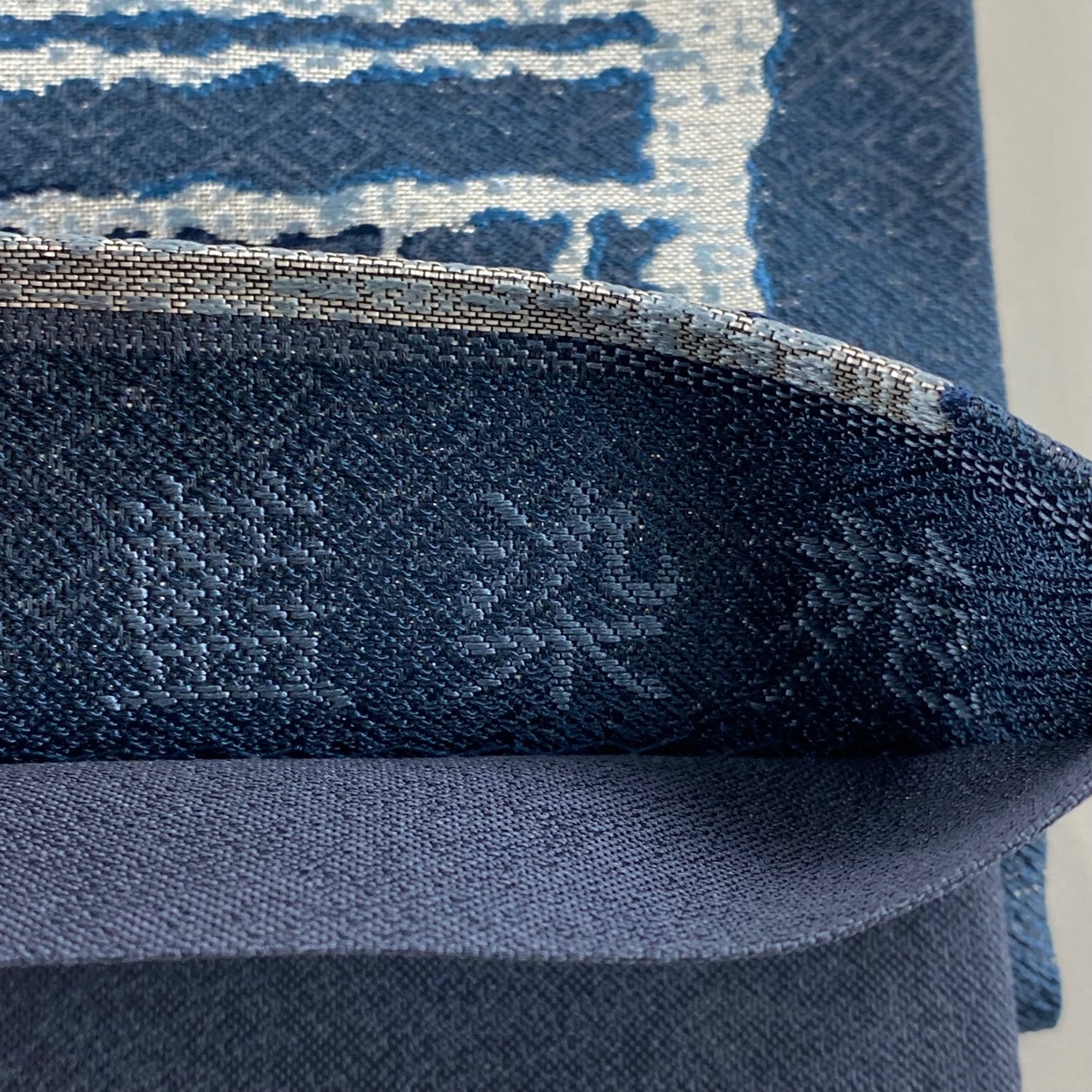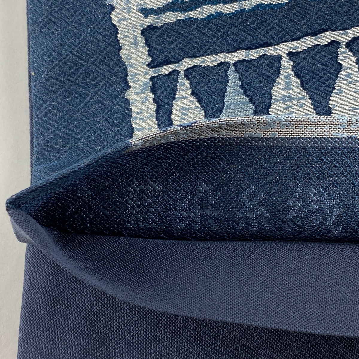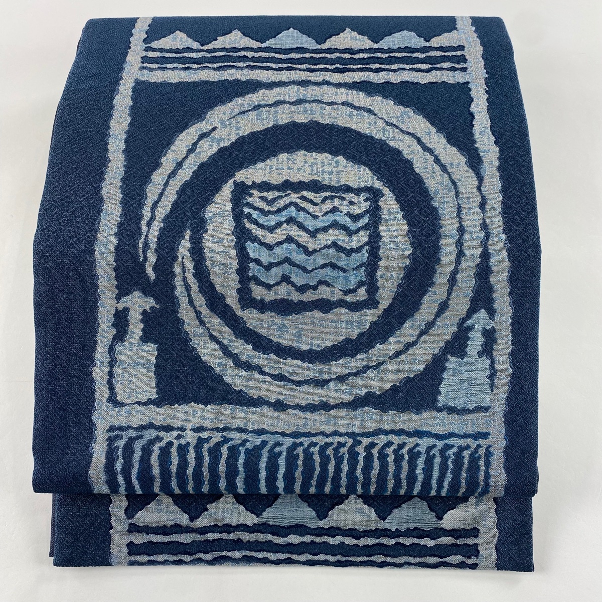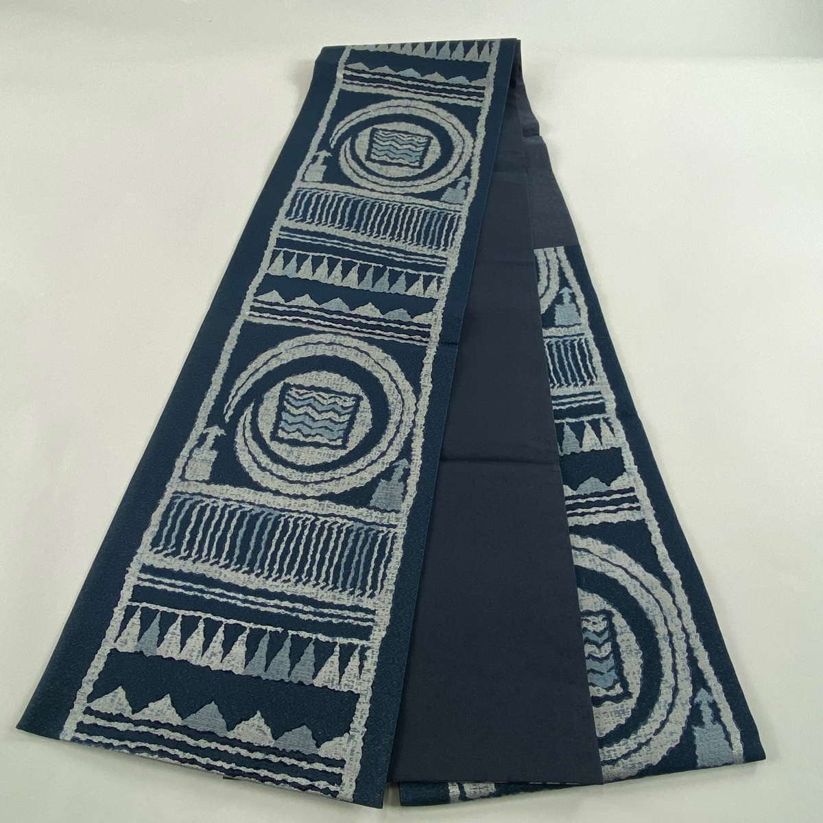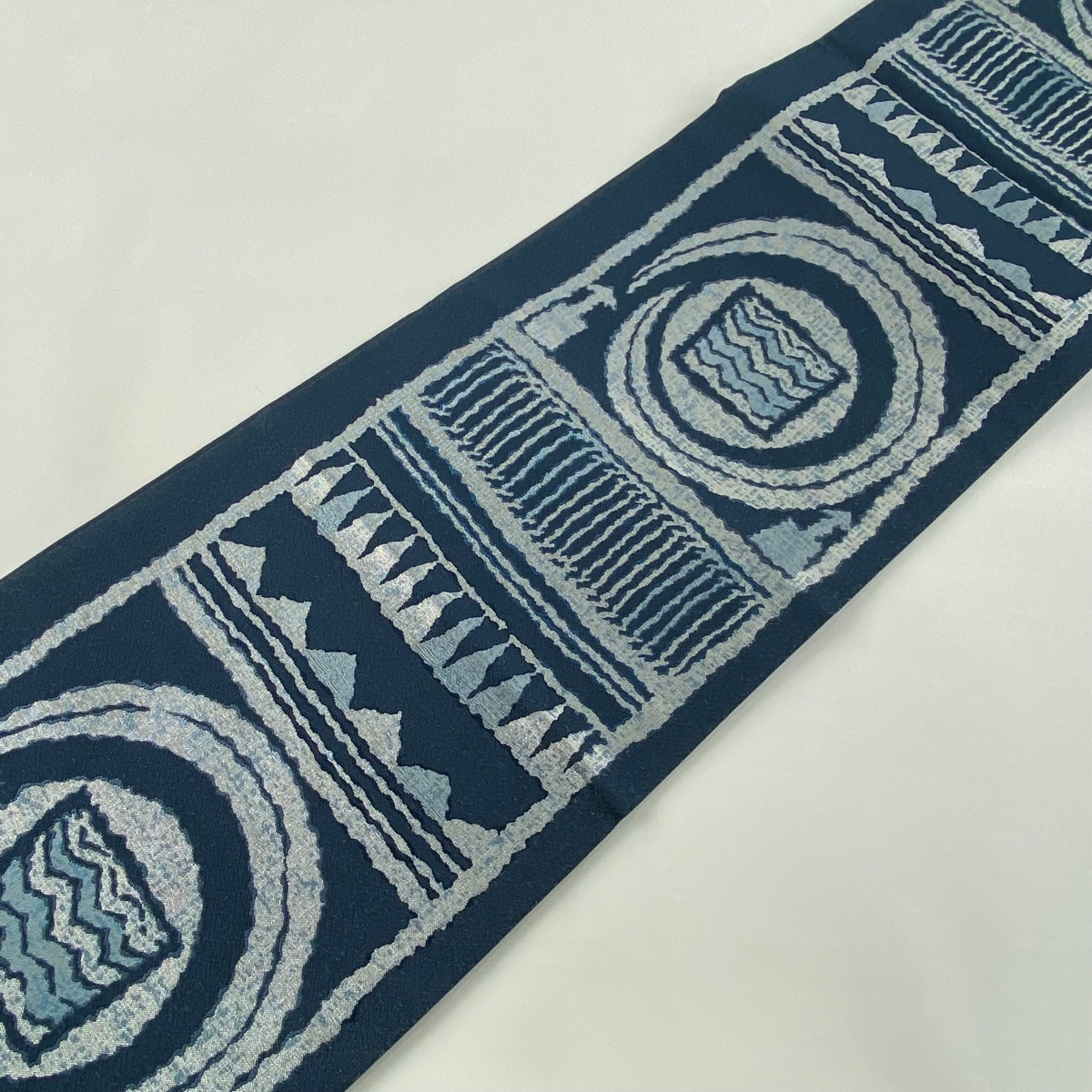 | 袋帯 美品 名品 証紙 本藍染糸織 藍染苑 幾何学模様 箔 藍色 六通 正絹 【中古】 |