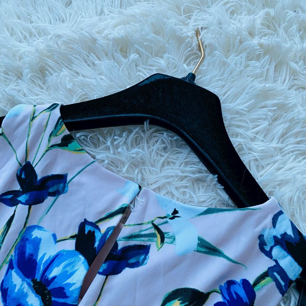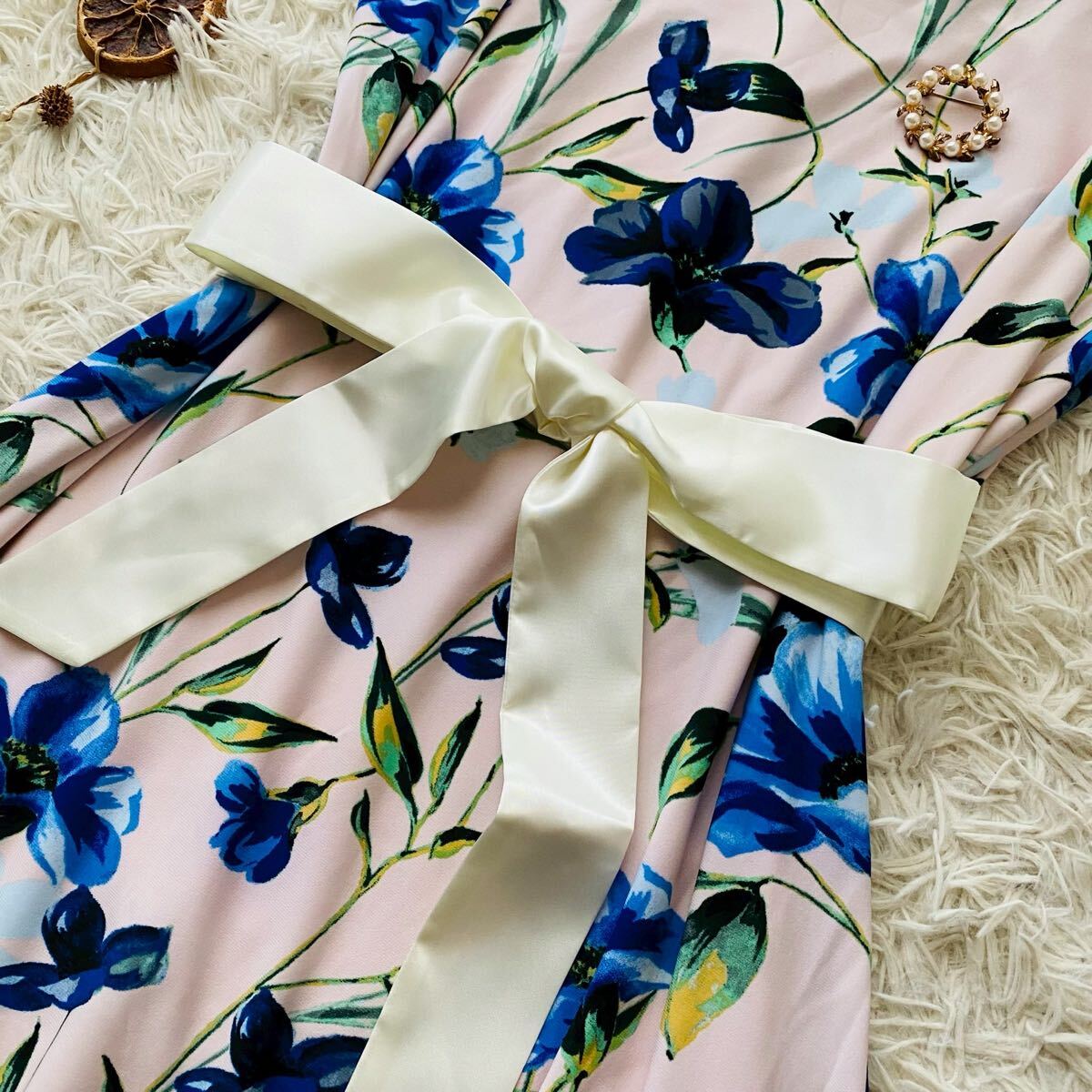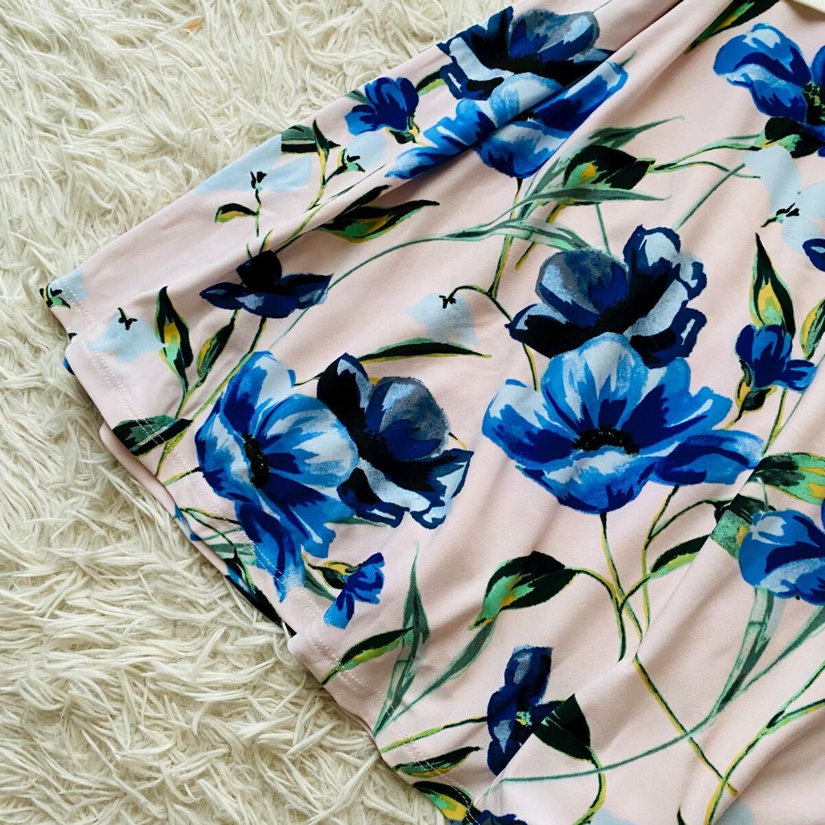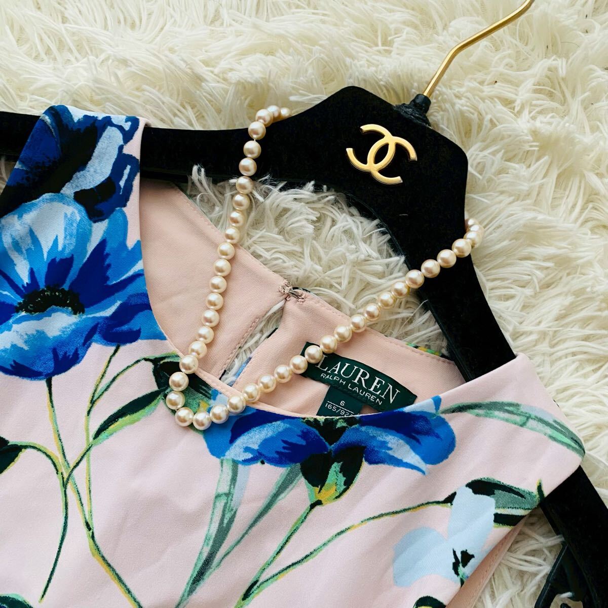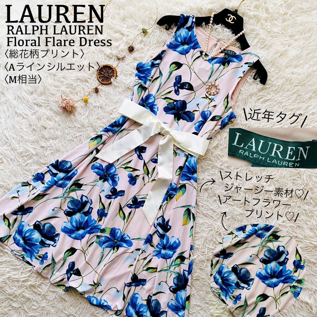 *近年モデルLAUREN RALPH LAURENのフレアドレス。なめらかなストレッチジャージーで仕立て、フェミニンなくすみベールピンクに、まるで絵画のような色鮮やかなアートフラワーモチーフが特徴。柔らかな手触りと、流れるようなドレープ素材がエレガントなアイテムです。