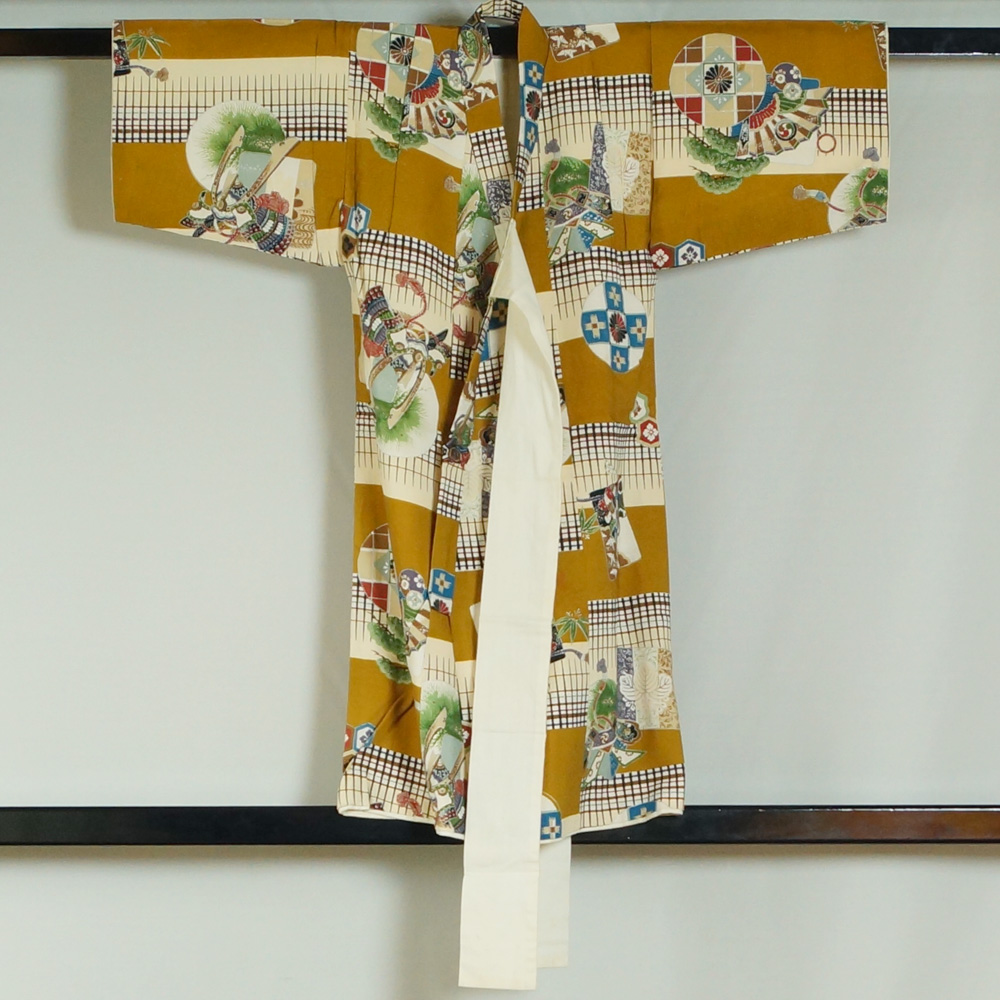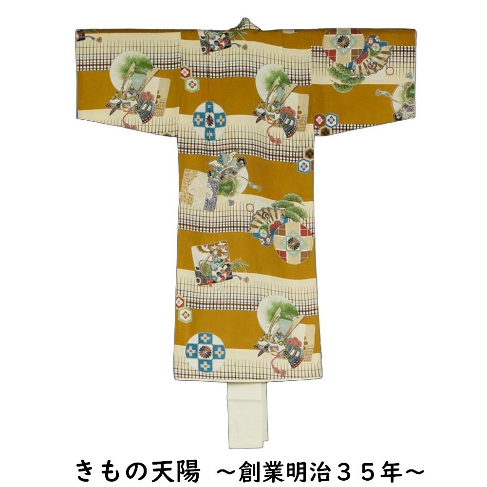 | 商品 説明 | 黄唐茶色系の地に色紙に兜、丸紋、格子などの模様が染められた男児用の着物です。 こちらは産着や5歳用着物ではなく、サイズ的におどらくもっと小さな男児向けのお着物となります。 |