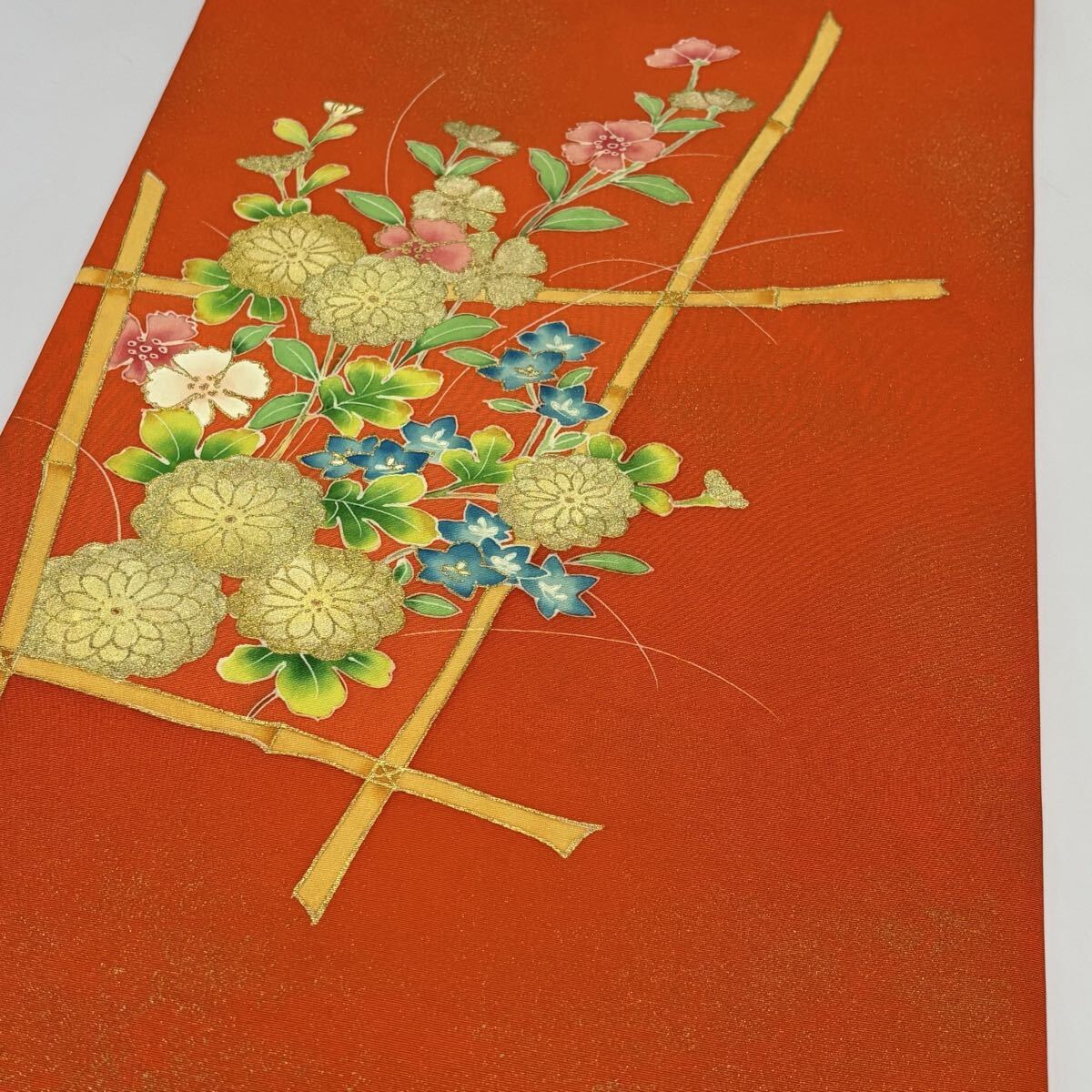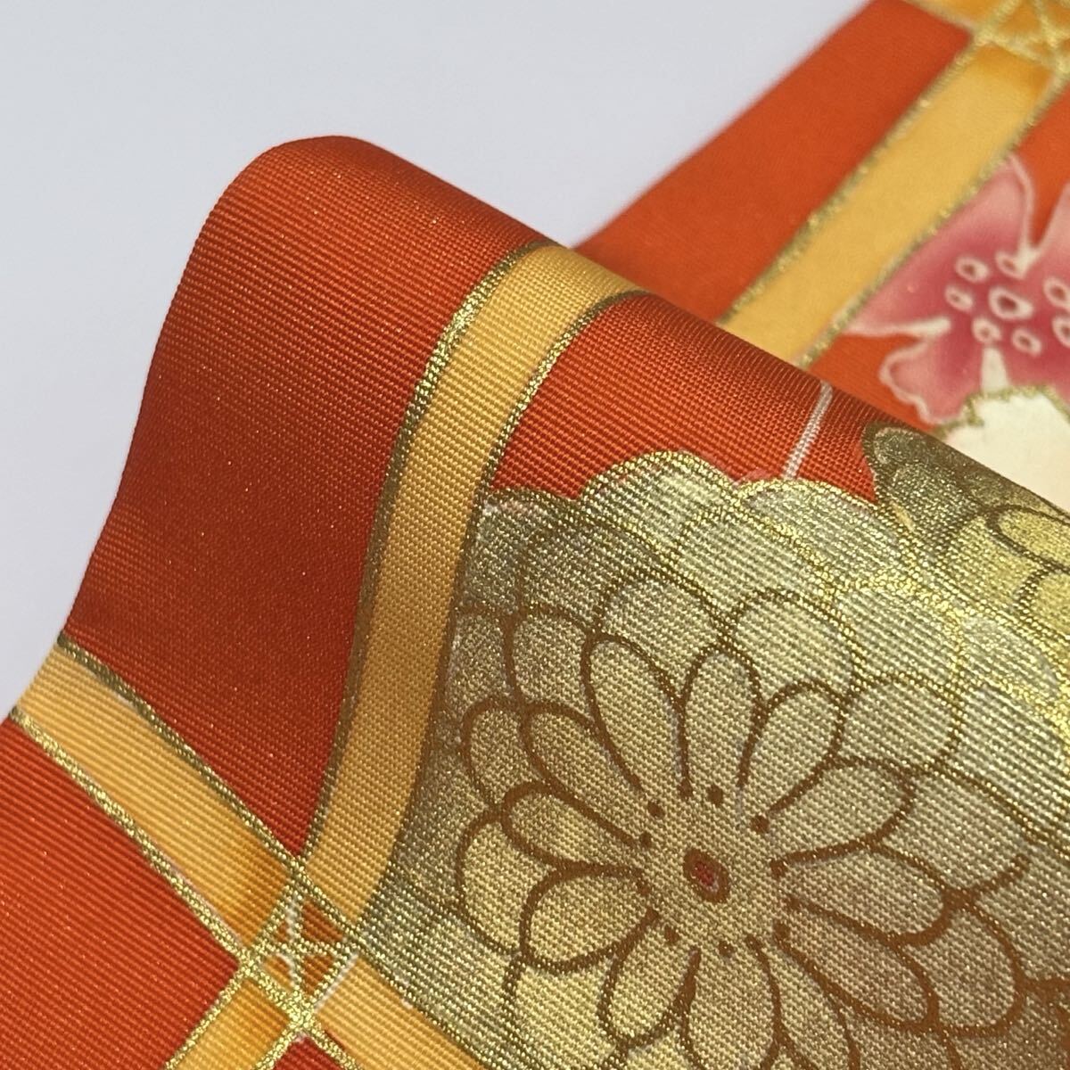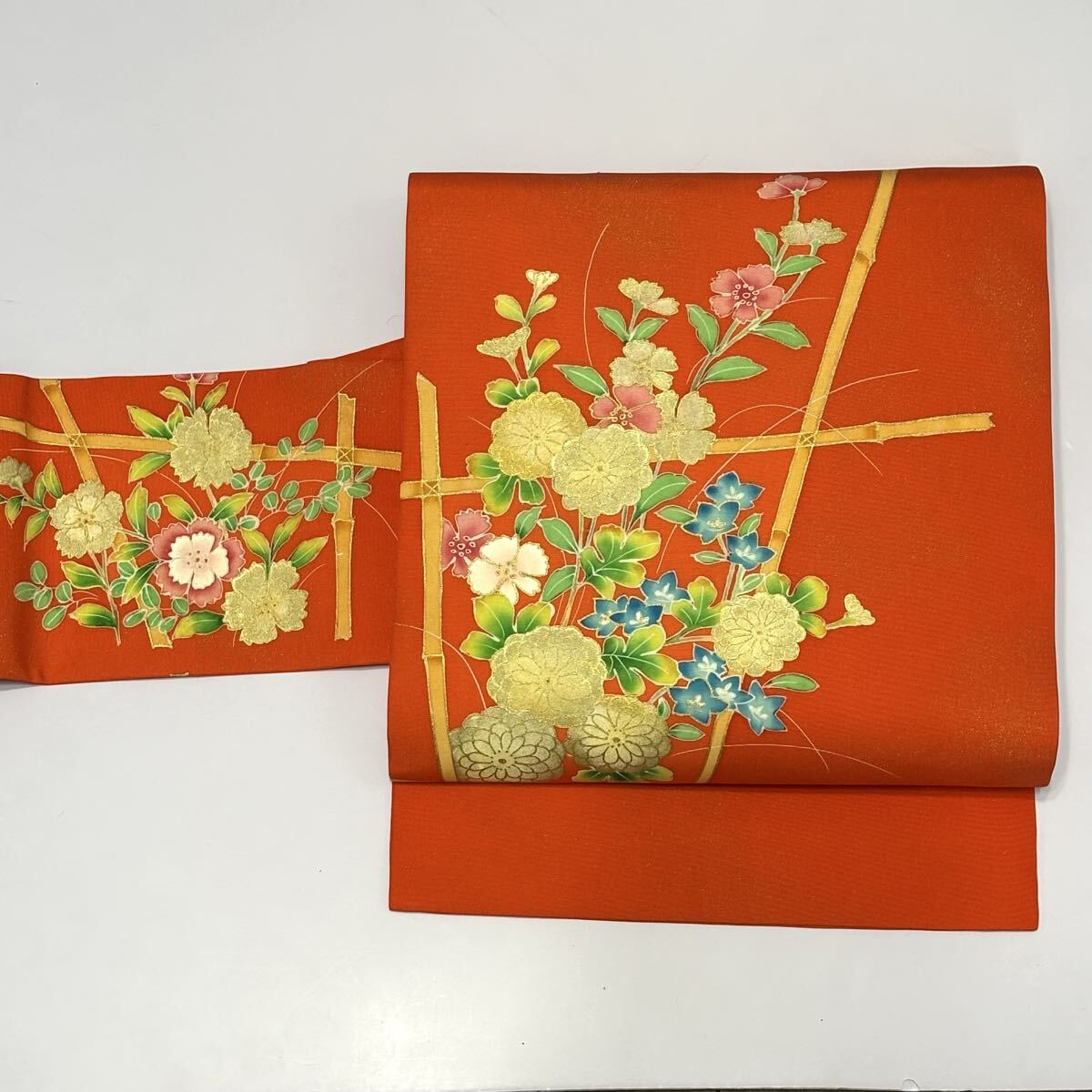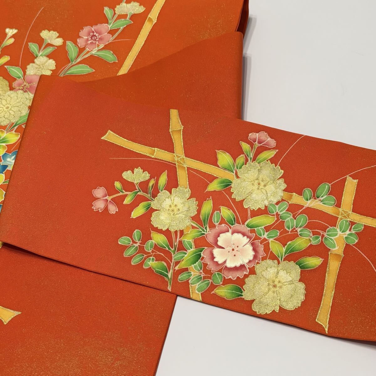 鮮やかな朱色に花柄が目を引く名古屋帯。