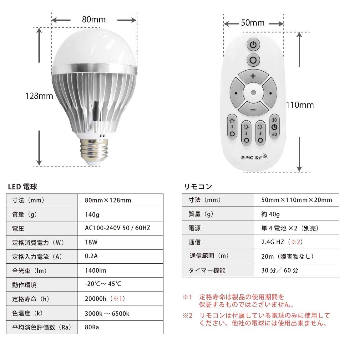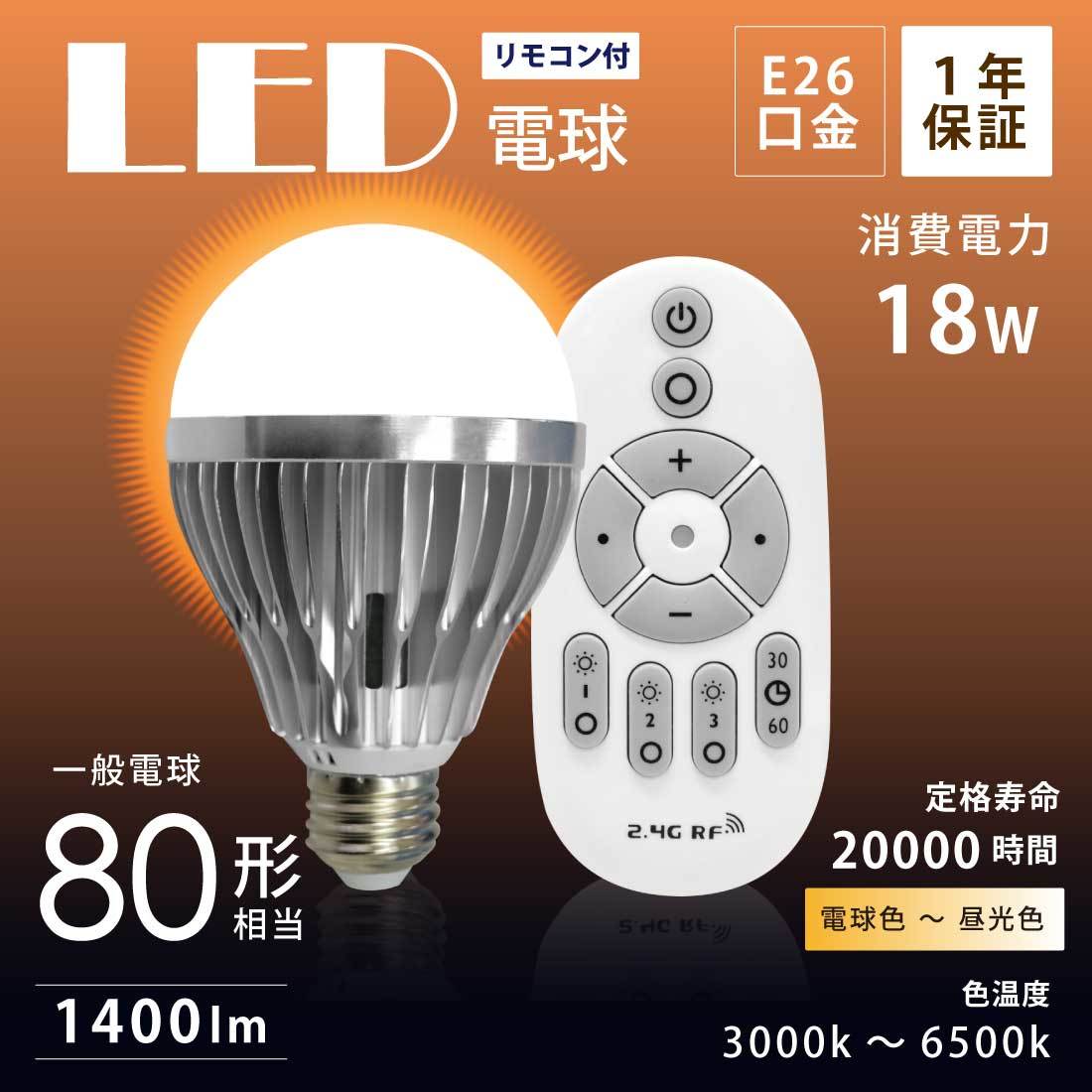 18WLED電球 80W相当 E26口金 1400lm 3000/6500k リモコン付き 調色 調光 照明 電球色 昼白色 昼光色