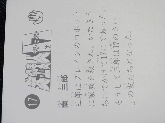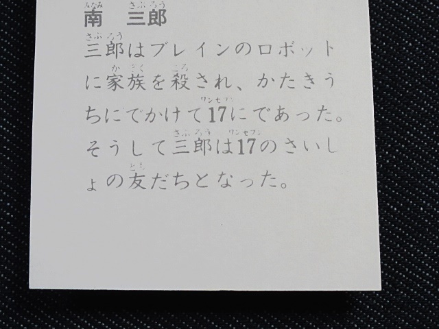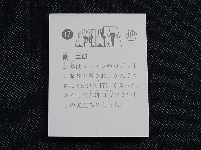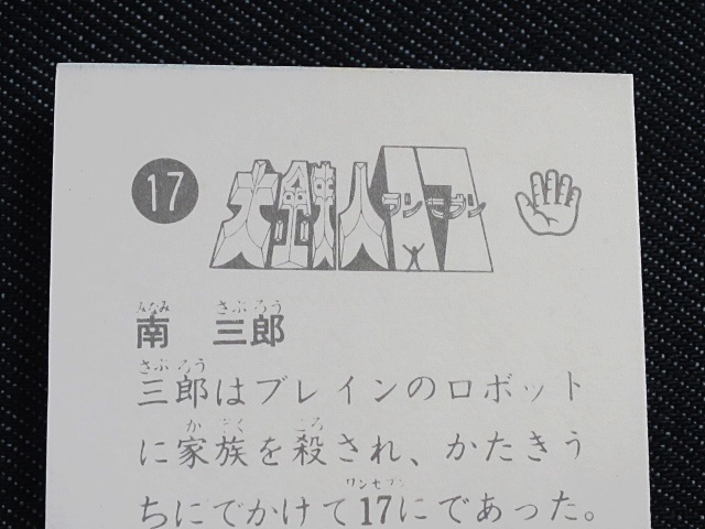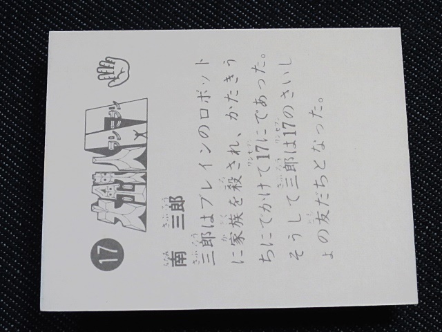 大鉄人 ミニカード バラ売り 1枚 1970年代 ・メーカー:天田 ・サイズ: 6.6 cm x 5.1 cm (裁断により若干誤差有り) ・発売時:1976年頃、当時の放送時に販売 ・構成:全60種シリーズ(1-60番.AL3種) ・発送:〒・各規格のサイズ内、重量内での同梱可能です。 〓参考項目〓 ・原作石森章太郎 ・脚本 伊上勝、上原正三、江連卓、熊谷節、安斉あゆ子 ・監督山田稔、若林幹、内田一作 ・放送局:TBS系列 ・放送期間:1977年3月18日-11月11日 ・全35話 ※出演者 ・南三郎 -神谷政浩 ・佐原千恵 -竹井みどり ・佐原博士 -中丸忠雄 ・剣持隊長 -原口剛 ・村中隊員 - 三井俊吾 ・海野隊員 - 菅野直之 ・小野隊員 - 大槻純子 ・岩山鉄五郎 -高品正広 ・岩山鉄次 -高橋仁 ・岩山エミ - 渡辺麻由美 ・佐原ルミ -島田歌穂 ・キャプテンゴメス -平田昭彦 ・ブラックタイガー -山本麟一 ・チーフキッド -山口あきら ・ハスラー教授 -大月ウルフ ・ピンクジャガー -三東ルシア ・ブルージャガー -太田美緒 ・ブレイン、ビッグエンゼル(声) -水島弘 ・ロボター(声) - 村松美枝子 ・ナレーター、ワンセブン(声) -小林恭治 | ||