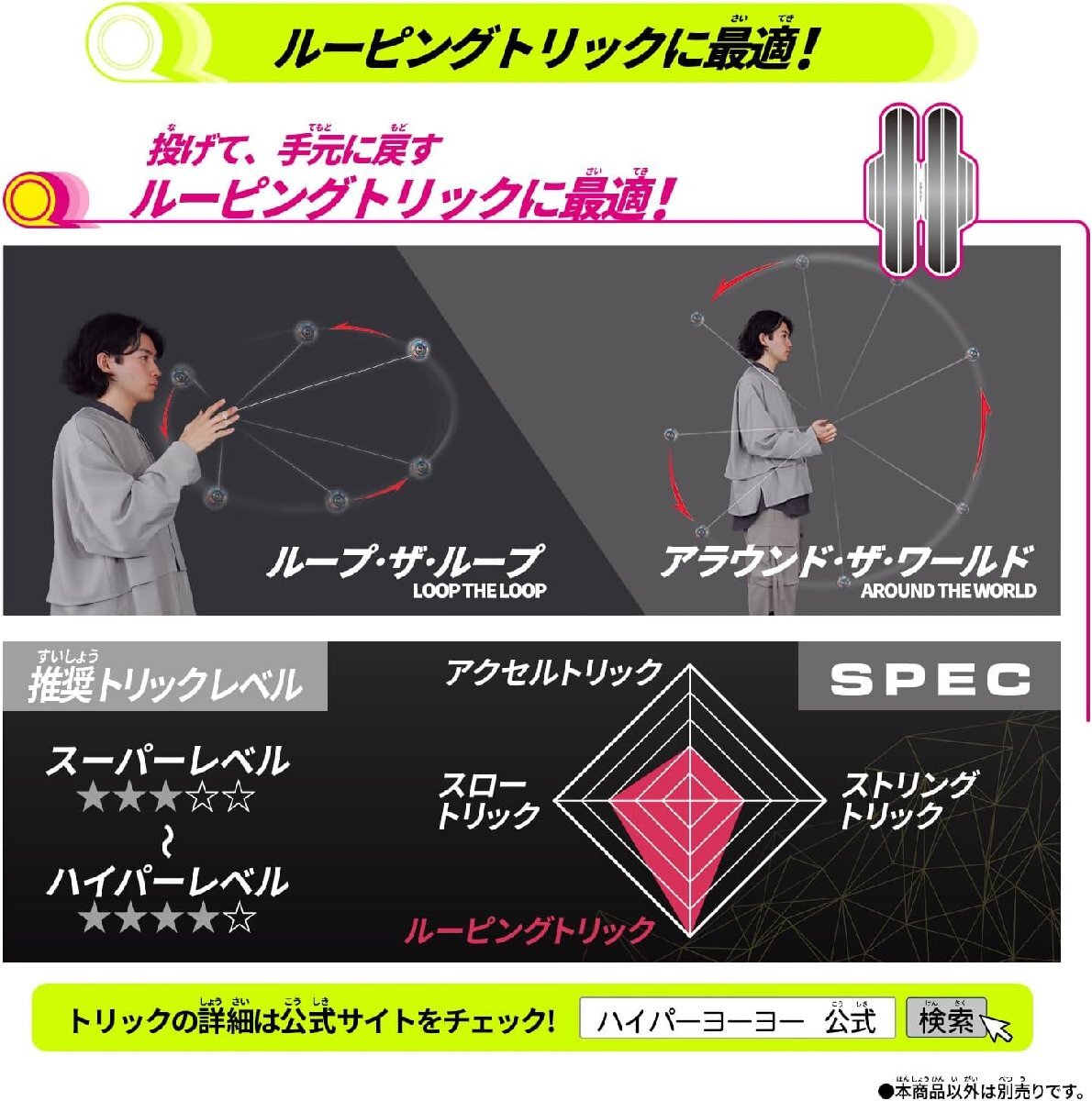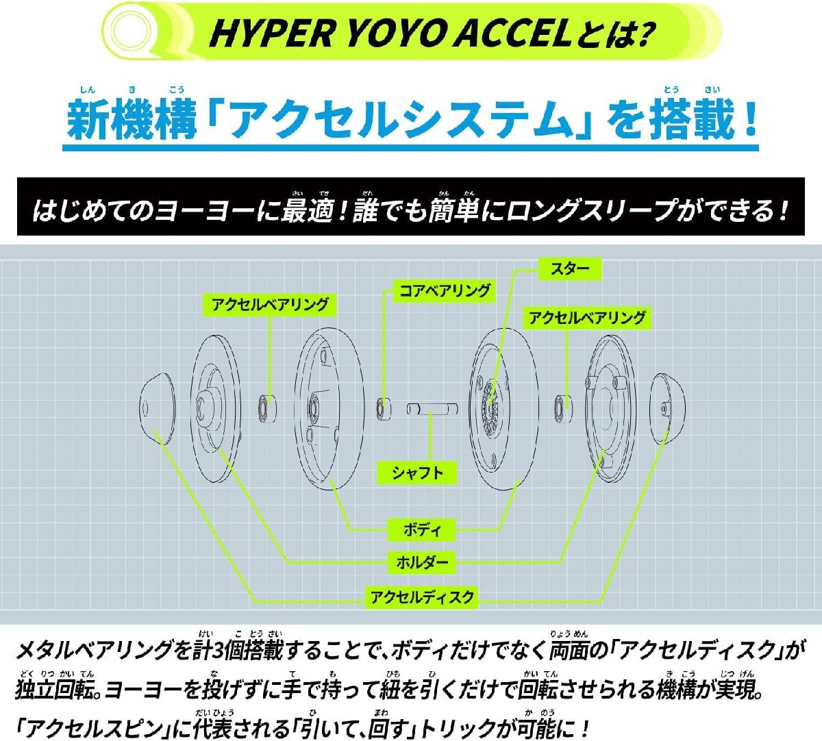 ◆本体を手に持った状態でストリングを勢いよく引くことで、本体を投げずに高速回転させることができる日米で特許出願済の新機能「アクセルシステム」を搭載したハイパーヨーヨーシリーズです。