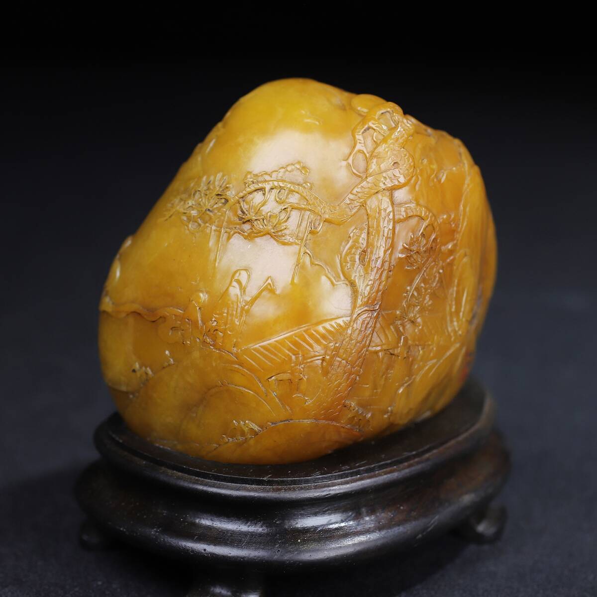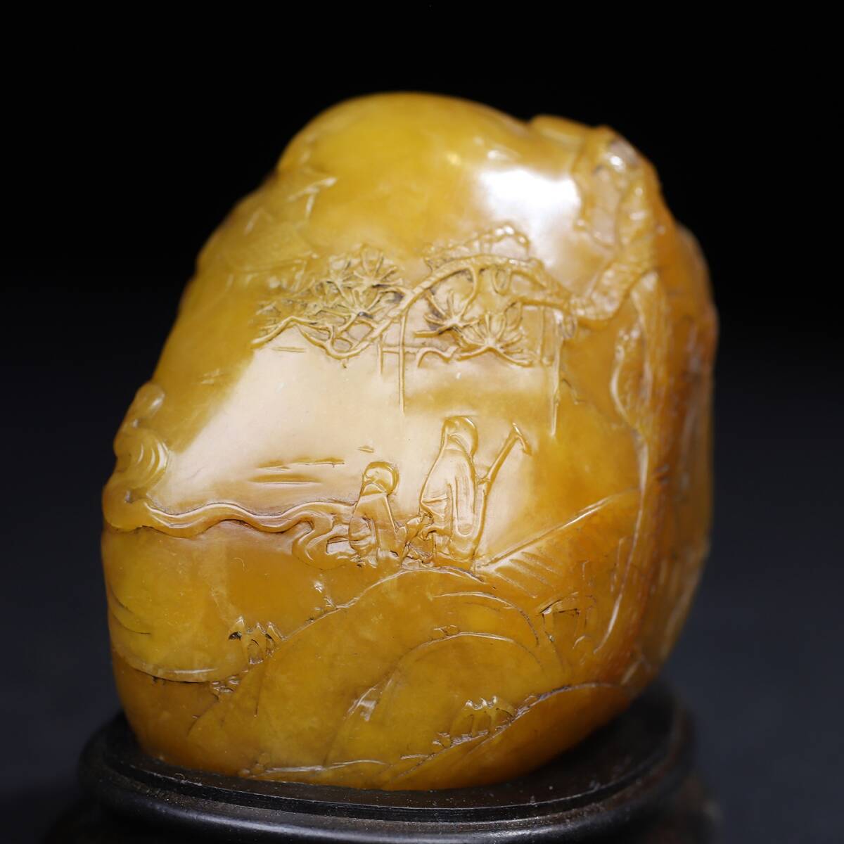 *珍品旧蔵* 【中国近現代篆刻家 潘玉茂】 寿山石 彫刻 攜童訪友山水人物紋 薄意 置物 天然石 手彫 篆刻 極細工 中国古玩 骨董品 古美味 H49