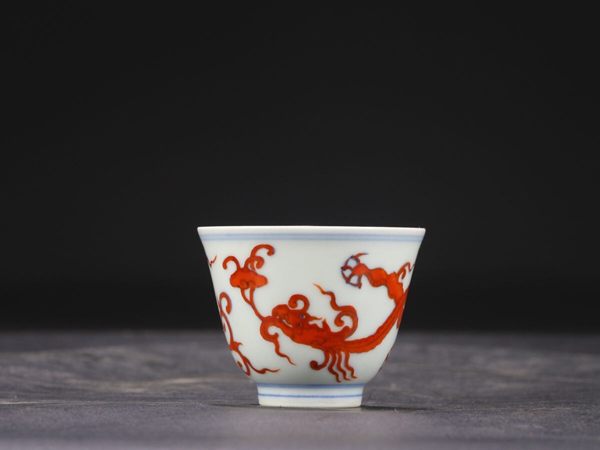 【瓏】陶磁器 礬紅龍紋 鈴鐺杯 大明成化年製 染付 置物擺件 古賞物 古美術 陶芸 蔵出