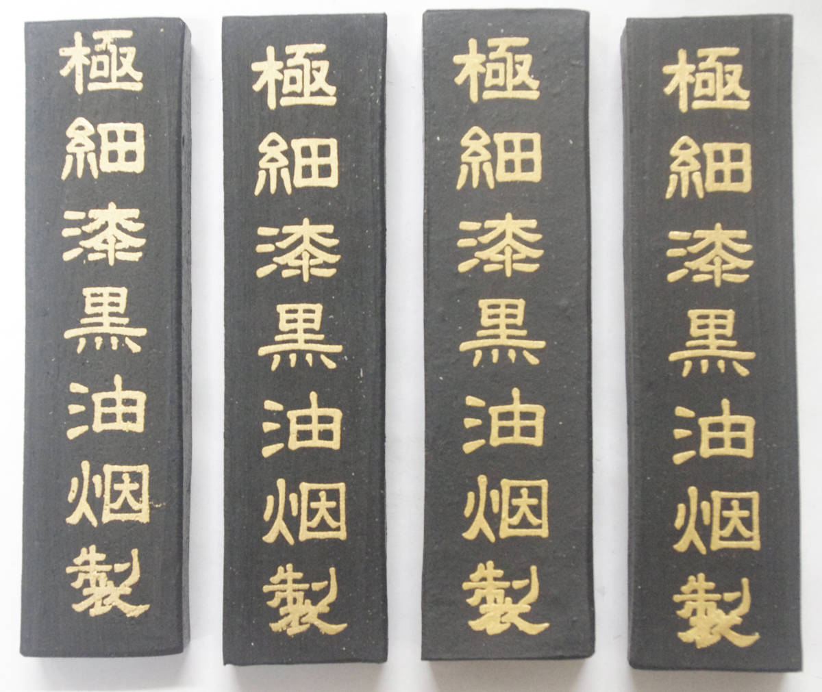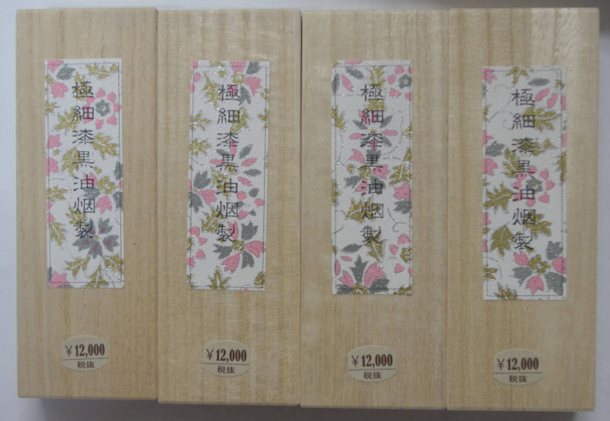 漆黒油煙「極細漆黒油煙製」5丁型4本セットの出品です。 4本セットです。艶のある漆黒が特徴で伸びもあります。 特に濃墨での使用をお勧めいたします。 サイズ 5丁型 約 縦133mmm横35mm 厚さ15mm 重さ約77g 全て完品未使用。桐箱入りです。 土日は休みの為取引連絡、発送が出来ません。 平日のみの対応になります。