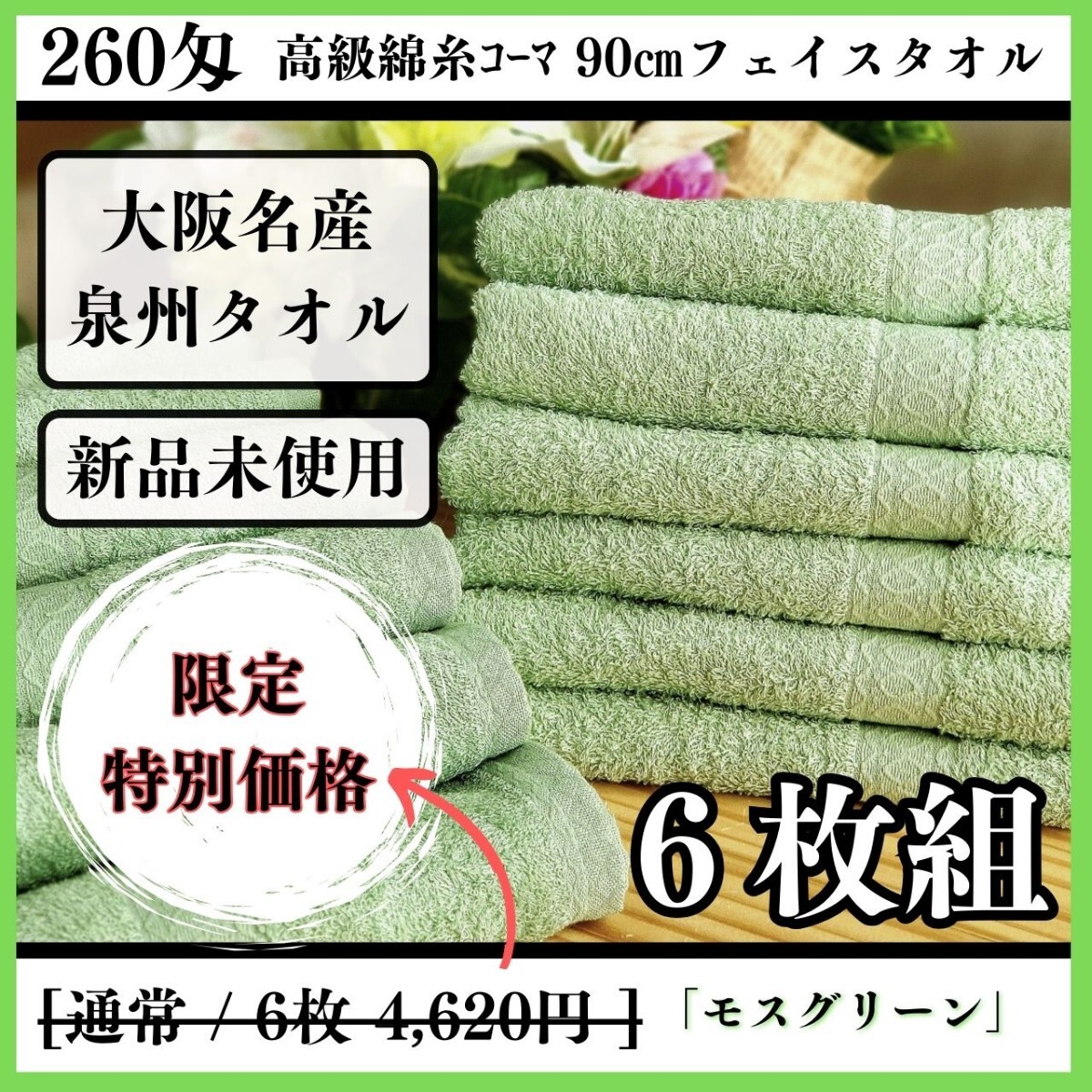 【泉州タオル】260匁高級綿糸コーマコットンモスグリーンフェイスタオルセット6枚入 長さ90cm まとめて 耐久性抜群 ふわふわ タオル新品