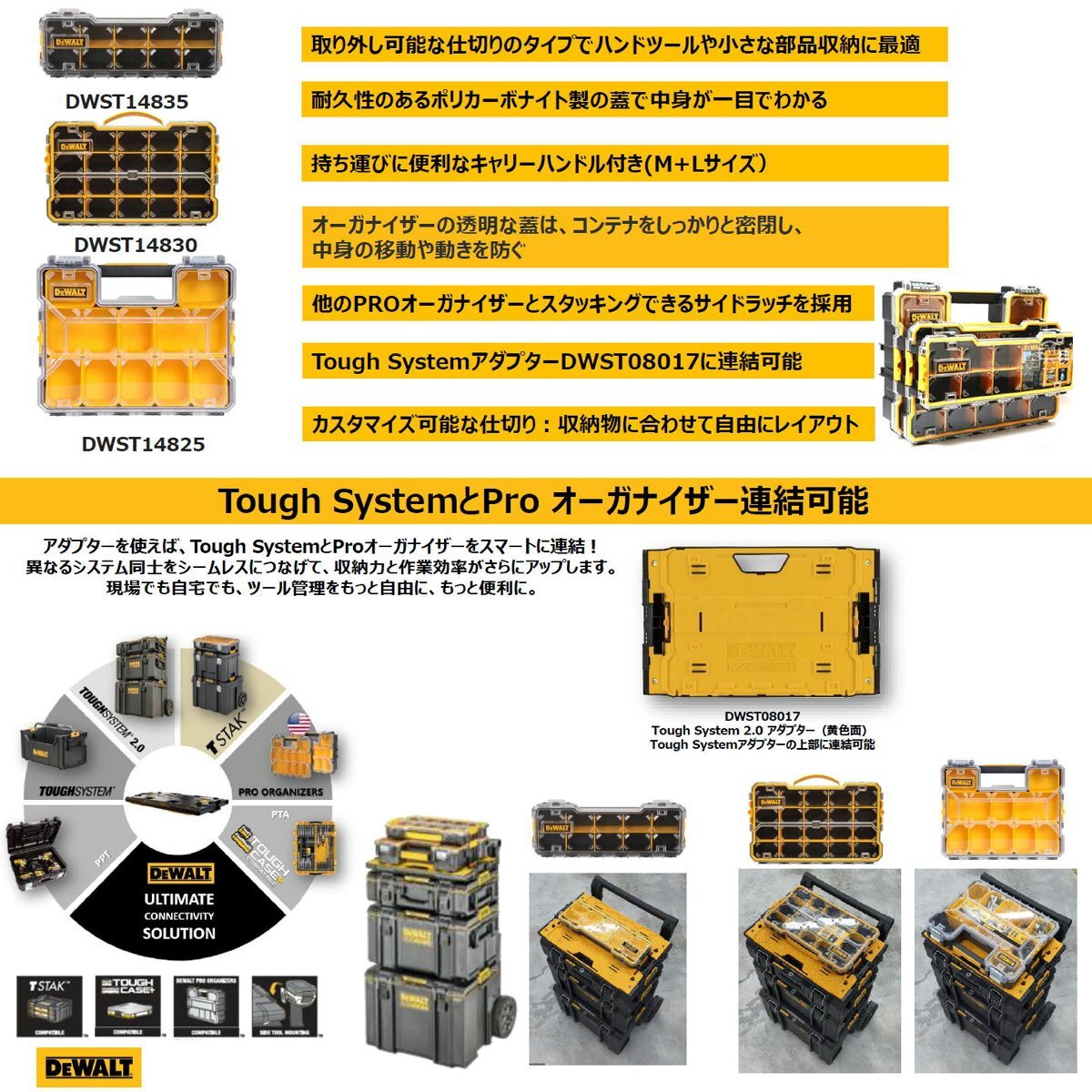 Proシリーズボックス同士の連結が可能。さらに、Tough Systemアダプター(DWST08017)を使えばTough Systemとの 連結も実現。現場や用途に合わせて、自由自在にカスタマイズできます。