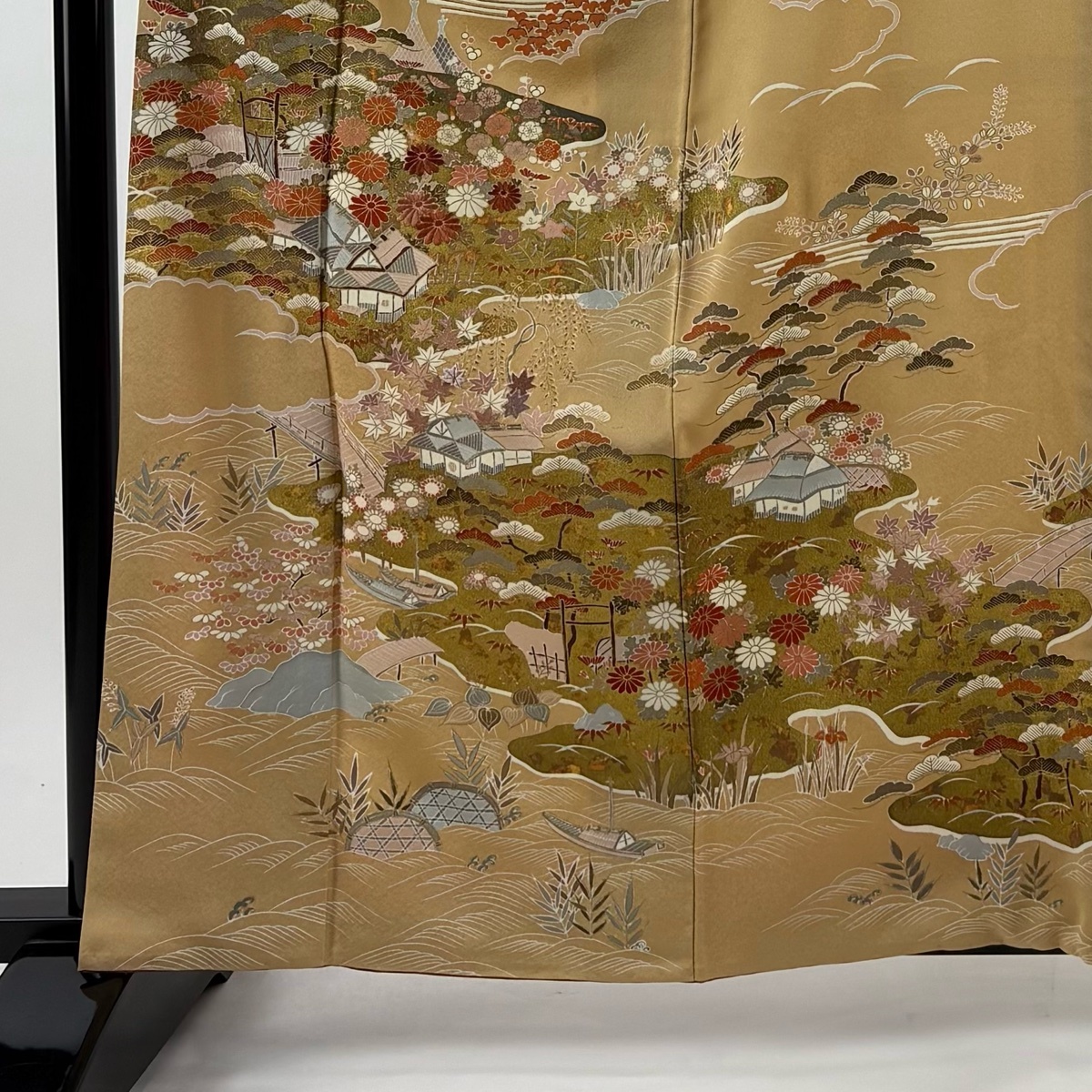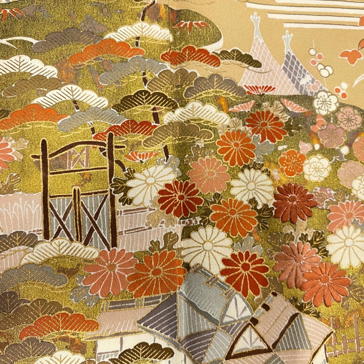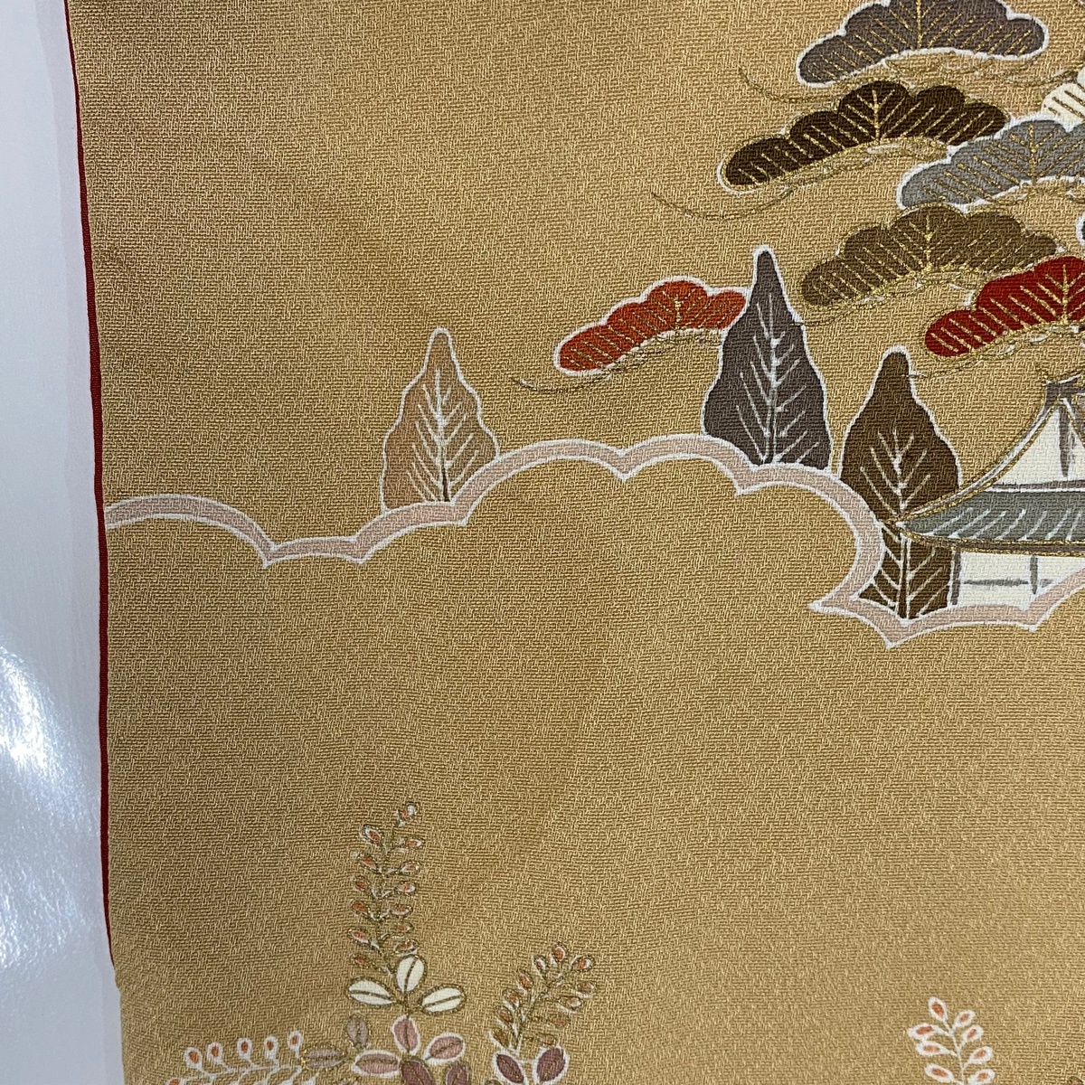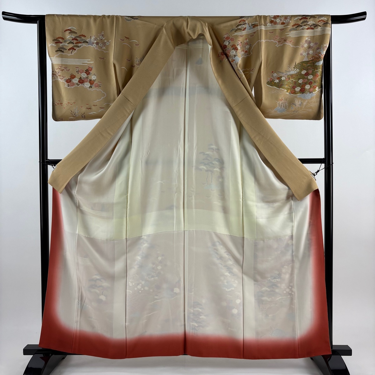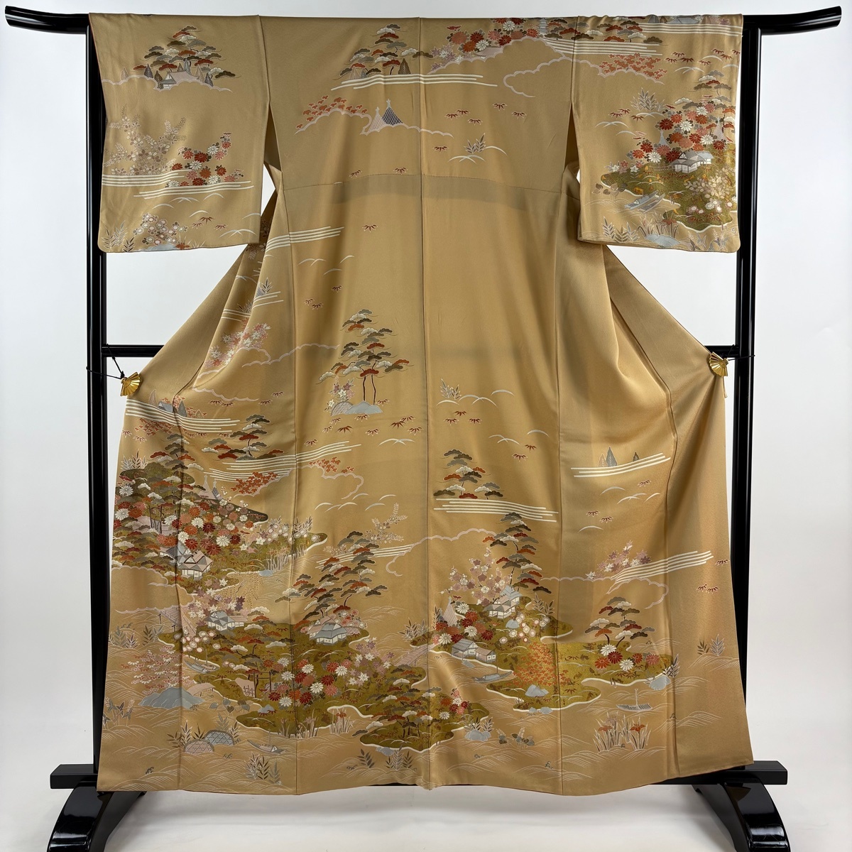 | 訪問着 秀品 松竹梅 建物 金彩 刺繍 ベージュ 袷 身丈162 裄丈63.5 S 正絹 【中古】 |