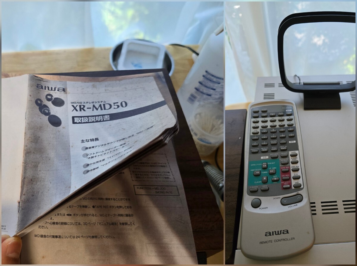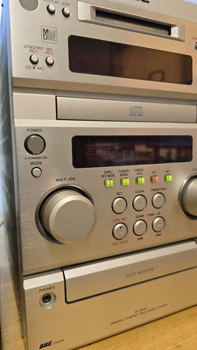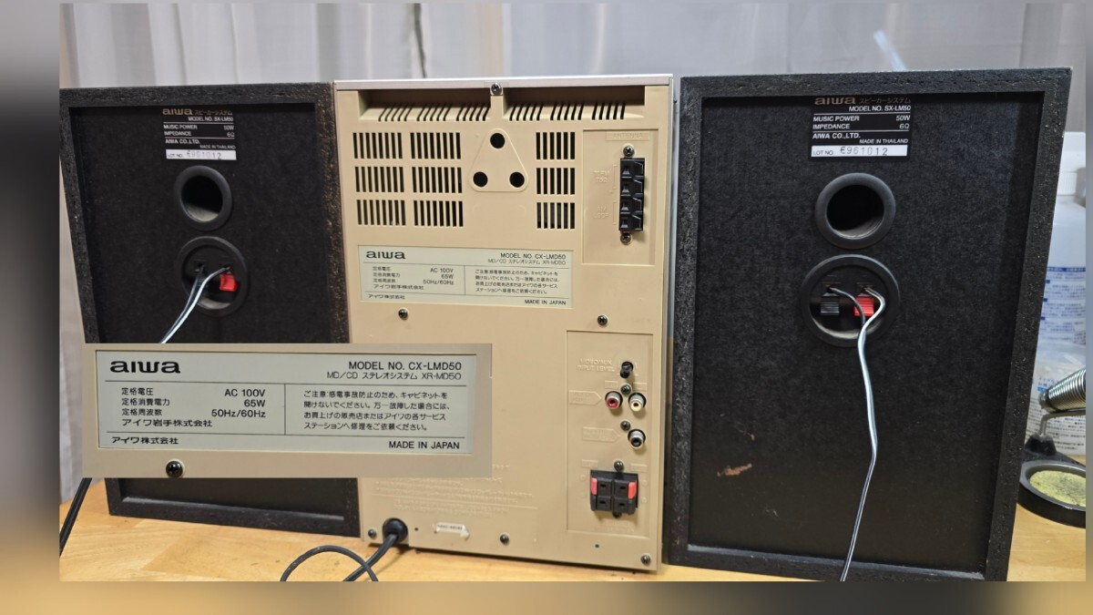 今回はこの個体を一通りメンテナンスし、動作品に仕上げました。CDピックアップレンズユニットは新品に交換済み。カセットデッキのベルト類も新品に交換し、テープの再生スピードも調整しました。ラジオはAM、FMとも問題なく動作します。ただ残念ながらMDデッキだけは復活出来ませんでした。不動ですが他の機能には支障ない状態です。