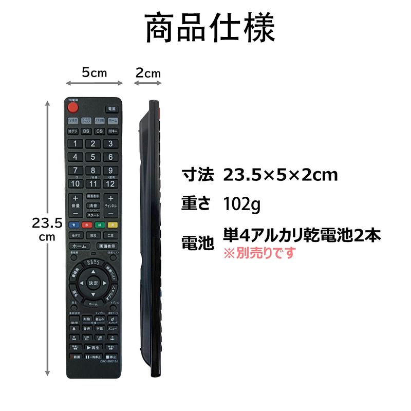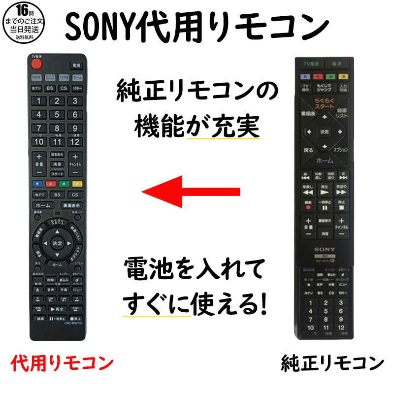 商品説明 | ・ソニー用の「代用リモコン」です。 ・純正リモコンに付いているボタンが設置されており、主な機能は全て使用できます。 ・本リモコンの設定は不要で、電池を入れればすぐに使用できます。 (リモコンモードを変更されている方は説明書をご参照ください。) ・ボタンの配置は多少異なります。 ・汎用リモコン、マルチリモコンでは使えない機能もご使用いただけます。 ・電池は別売りです。 |