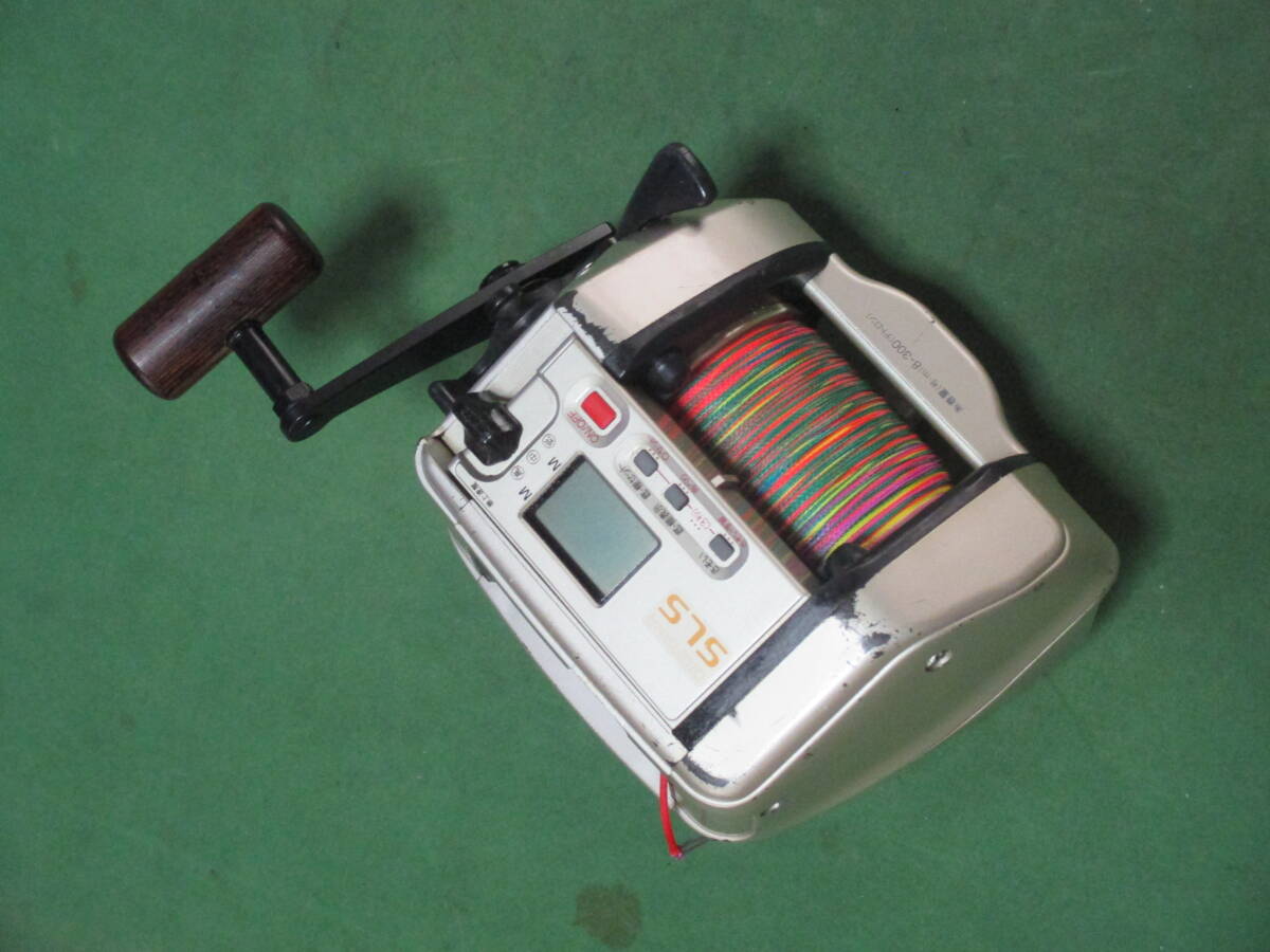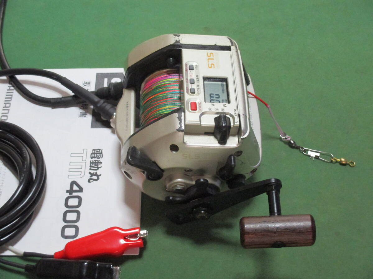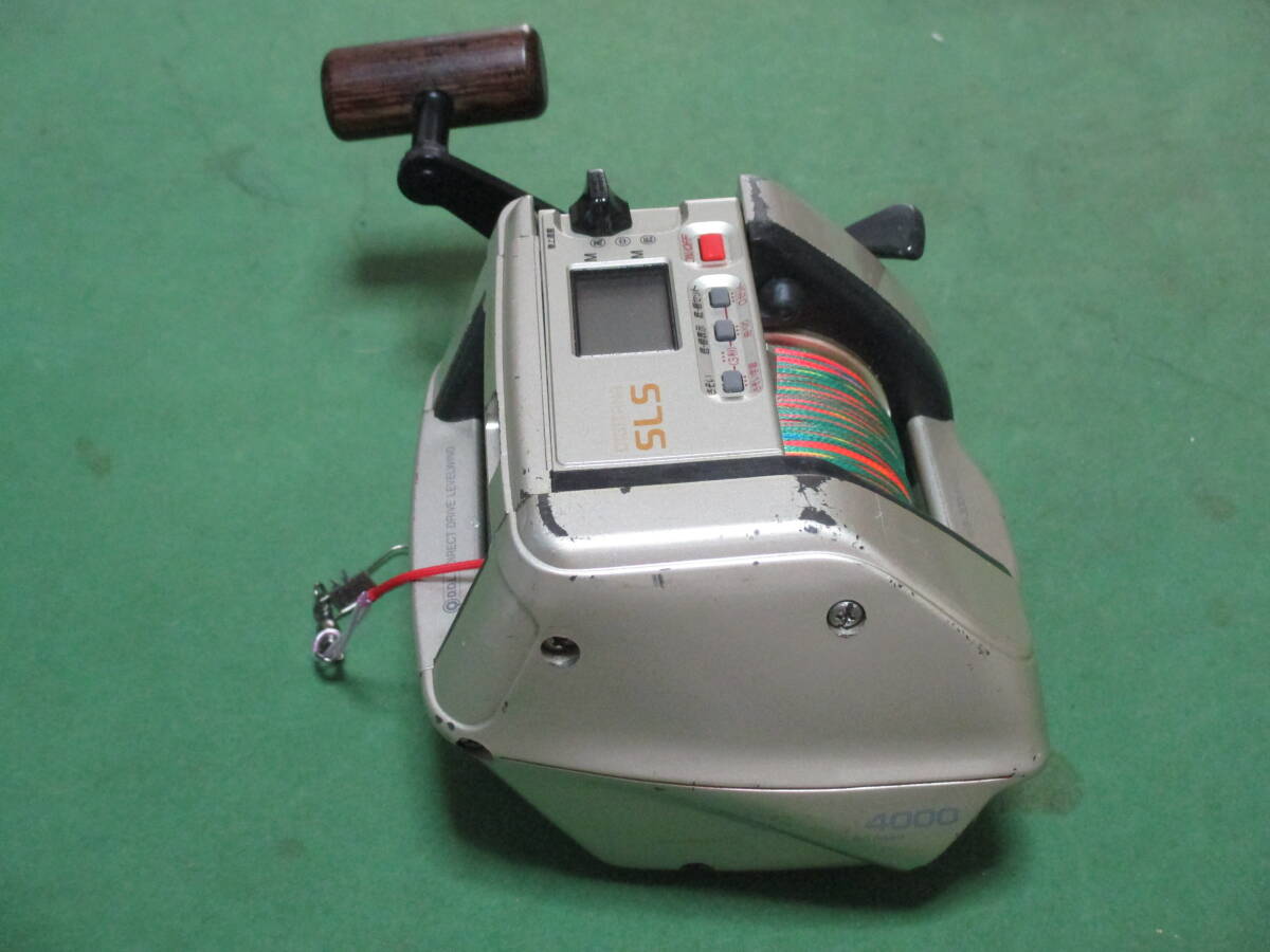 R7年11月  OHクリーニング済。      外観は・・小キズ、擦りキズ、多く見られるも、全体的には ゴールド系の色調は 多少後退気味にも、まだ輝いていて 一見キレイ。  スプールは ナイロンフルライン のまま長期仕舞われ機の様子。  初めての開放で、定トルクの各ビスは 固くカチンと乾燥した快音で戻る。  中は・・新台当時のグリスは汚れが少なくキレイ、ドラグの汚れも少なく、サビ、磨耗、劣化は見られずで 使用頻度は 比較的少な目な希使用機で 仕舞いっ放しの感じ。 パーツ類は・・キレイな古グリス拭き取り-洗浄-磨き の工程を経て、一点ずつグリスUPしながら丁寧に組み戻し なおキレイに仕上がっている。   モーターは・・ 力強く回り 絶好調!。 ベアリングは ・・左中右共に加圧グリスUP、 ワインダーも円滑に!。 スプール内の変速ギァは乾燥気味でもキレイで、あまり回されていない感じ。  ハンドルは・・キャップ下にサビ気配見られ スプレーで薄化粧。  モニターは・・色濃く鮮明で、各機能は・・全然OK!。  ラインは・・スプールチェックついでに  まだキレイなナイロンラインを降ろし 新品 PE  8号×320m   を装填しライン出し、自動巻き上げ計測し 末端処理しておいた。 本体に取説(コピー)付き  2ピン電源コードは、付属として 社外新品を同梱発送します。  大型 シンプル機能、頑丈で持ち重りするも高出力で人気の機種で、程度のいいO/H済み中古としては 稀少出品です。明日からでも思いっきり使える好調機です。検討してみてください。・・(委託機:3Nでお願いします)