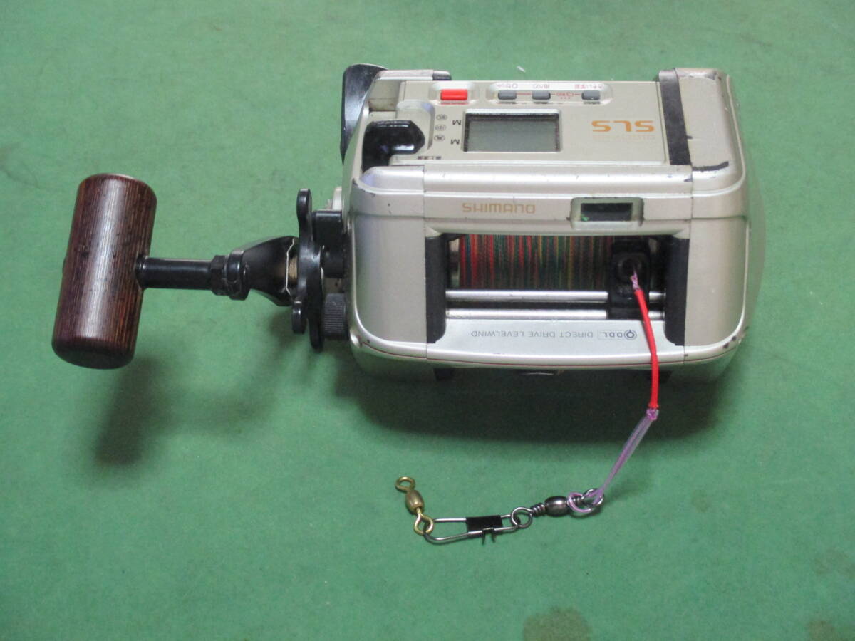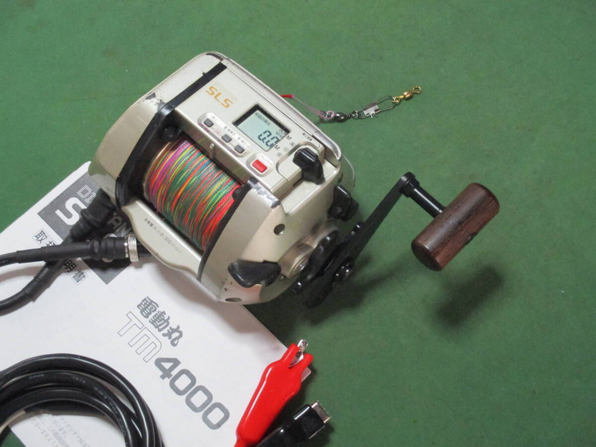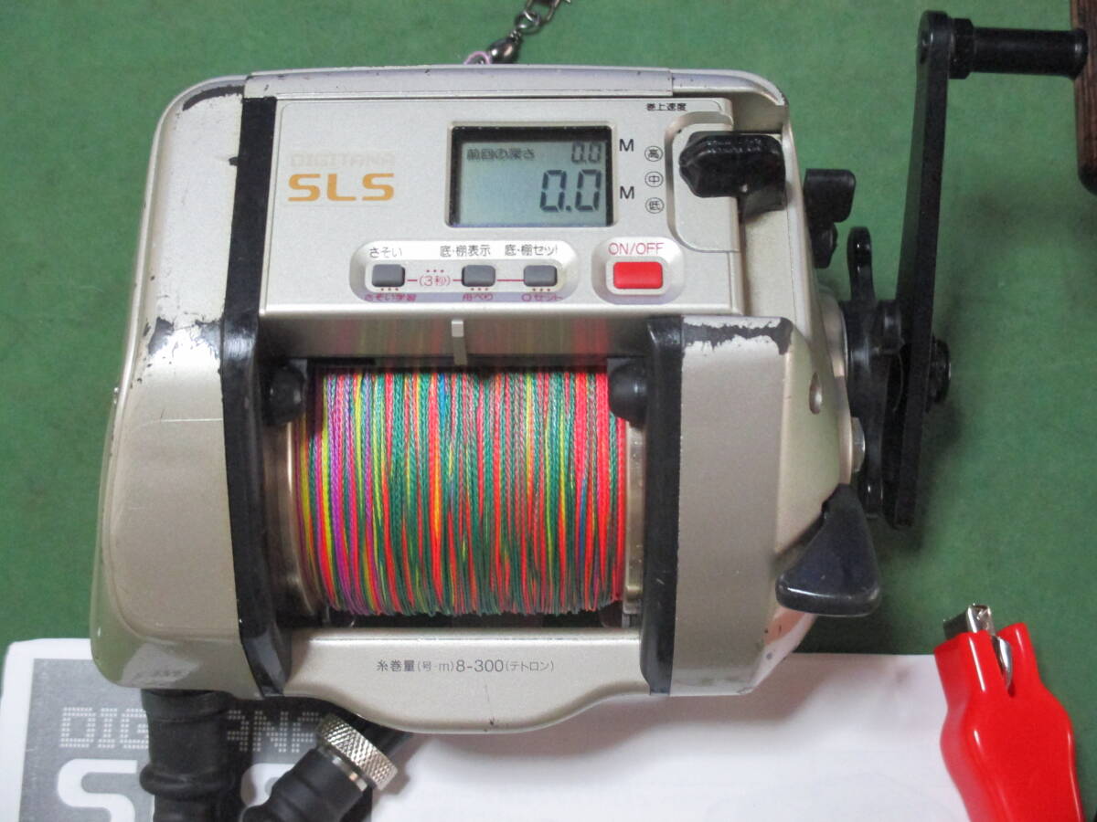 R7年11月  OHクリーニング済。      外観は・・小キズ、擦りキズ、多く見られるも、全体的には ゴールド系の色調は 多少後退気味にも、まだ輝いていて 一見キレイ。  スプールは ナイロンフルライン のまま長期仕舞われ機の様子。  初めての開放で、定トルクの各ビスは 固くカチンと乾燥した快音で戻る。  中は・・新台当時のグリスは汚れが少なくキレイ、ドラグの汚れも少なく、サビ、磨耗、劣化は見られずで 使用頻度は 比較的少な目な希使用機で 仕舞いっ放しの感じ。 パーツ類は・・キレイな古グリス拭き取り-洗浄-磨き の工程を経て、一点ずつグリスUPしながら丁寧に組み戻し なおキレイに仕上がっている。   モーターは・・ 力強く回り 絶好調!。 ベアリングは ・・左中右共に加圧グリスUP、 ワインダーも円滑に!。 スプール内の変速ギァは乾燥気味でもキレイで、あまり回されていない感じ。  ハンドルは・・キャップ下にサビ気配見られ スプレーで薄化粧。  モニターは・・色濃く鮮明で、各機能は・・全然OK!。  ラインは・・スプールチェックついでに  まだキレイなナイロンラインを降ろし 新品 PE  8号×320m   を装填しライン出し、自動巻き上げ計測し 末端処理しておいた。 本体に取説(コピー)付き  2ピン電源コードは、付属として 社外新品を同梱発送します。  大型 シンプル機能、頑丈で持ち重りするも高出力で人気の機種で、程度のいいO/H済み中古としては 稀少出品です。明日からでも思いっきり使える好調機です。検討してみてください。・・(委託機:3Nでお願いします)