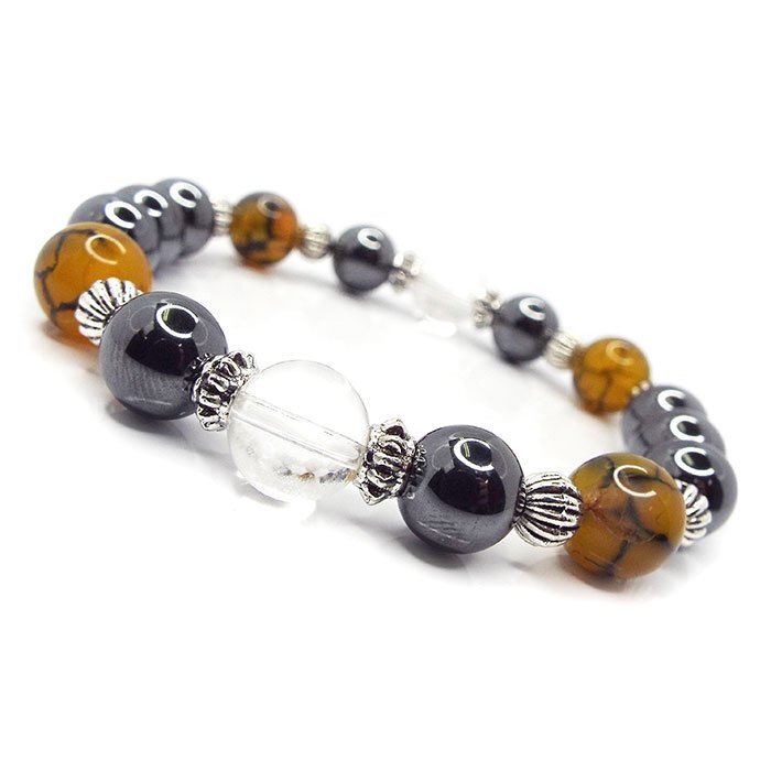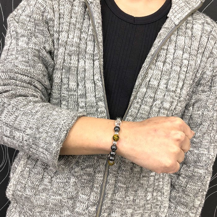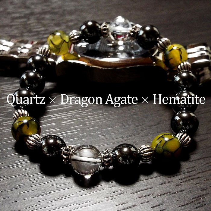 【STONE KITCHEN 天然石 パワーストーン】 ドラゴンアゲートはその名の通り龍のウロコのような 模様が特徴的な瑪瑙の一種です。 古くから龍の神秘的な力が宿ると言われて 瑪瑙の中でも特に縁起の良いものとして扱われ、 特に古代中国では龍をとても大切に扱っていた為、 この石も珍重されていたようです。 現代になっても龍は上昇や成功、出世を意味すると知られています。 内周:約18cm サイズ:水晶 10mm ドラゴンアゲート 10mm ヘマタイト 10mm 1点 注意事項 ※金属部分は汗や汚れ等で変色する場合がございます。気になる場合は 金属磨きや布等で軽くふき取る事をおすすめします。 ※石の種類によっては、艶を引き出すことを目的として、ワックスや着色加工がされているものもあります。 ※表示のサイズは必ずしも最大値・最小値のサイズのものが入っているわけではございません。 ※天然石のため同じものでも色味・模様などが異なります。 ※照明の具合で実際とは色合いが異なる場合がございます。 また、天然素材特有のクラック・内包物を有する場合がございます。予めご了承下さい。 | |||