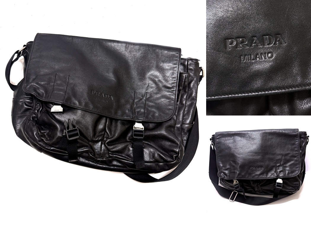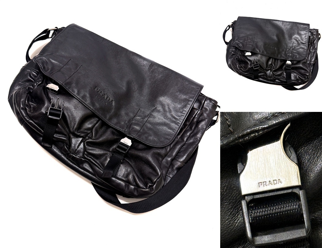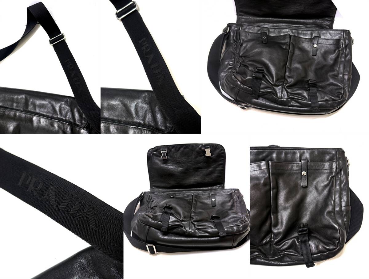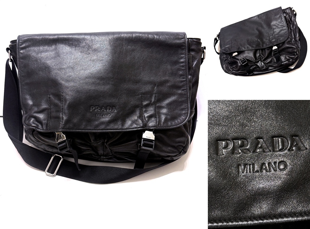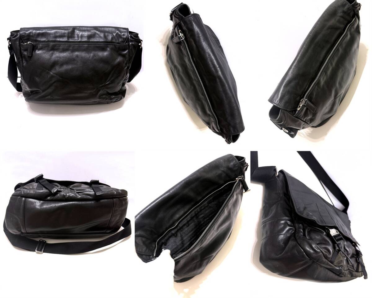 美品 レア PRADA プラダ ラム レザー メッセンジャー ショルダー バッグ  ハイエンド 定価35万 ロゴ エンボス ブラック メンズ 希少 黒