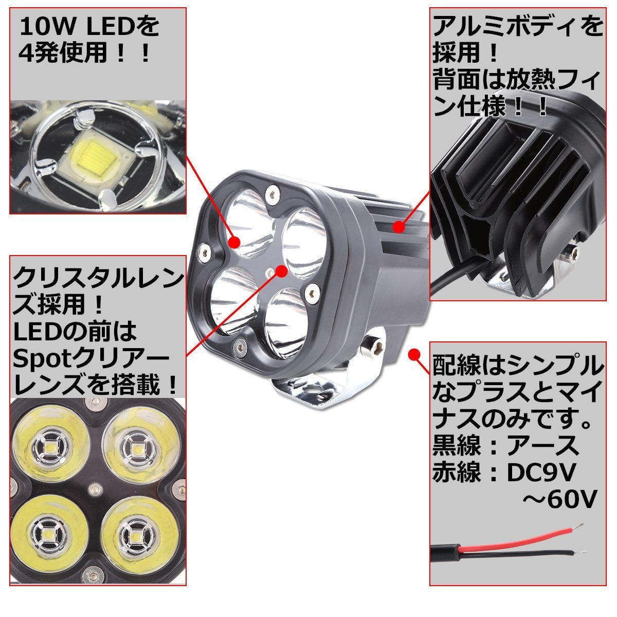 | 40W ミニLED作業灯 数量:1個 点灯カラー:ホワイト 動作電圧:DC9V?DC60V 極性:あり(+?)。黒線がアース。 防水性能:あり(IP67、浸水使用はできません。) 商品サイズ:画像に記載 公示光束:不明 重量:約0.43kg LED:10W×4発 |