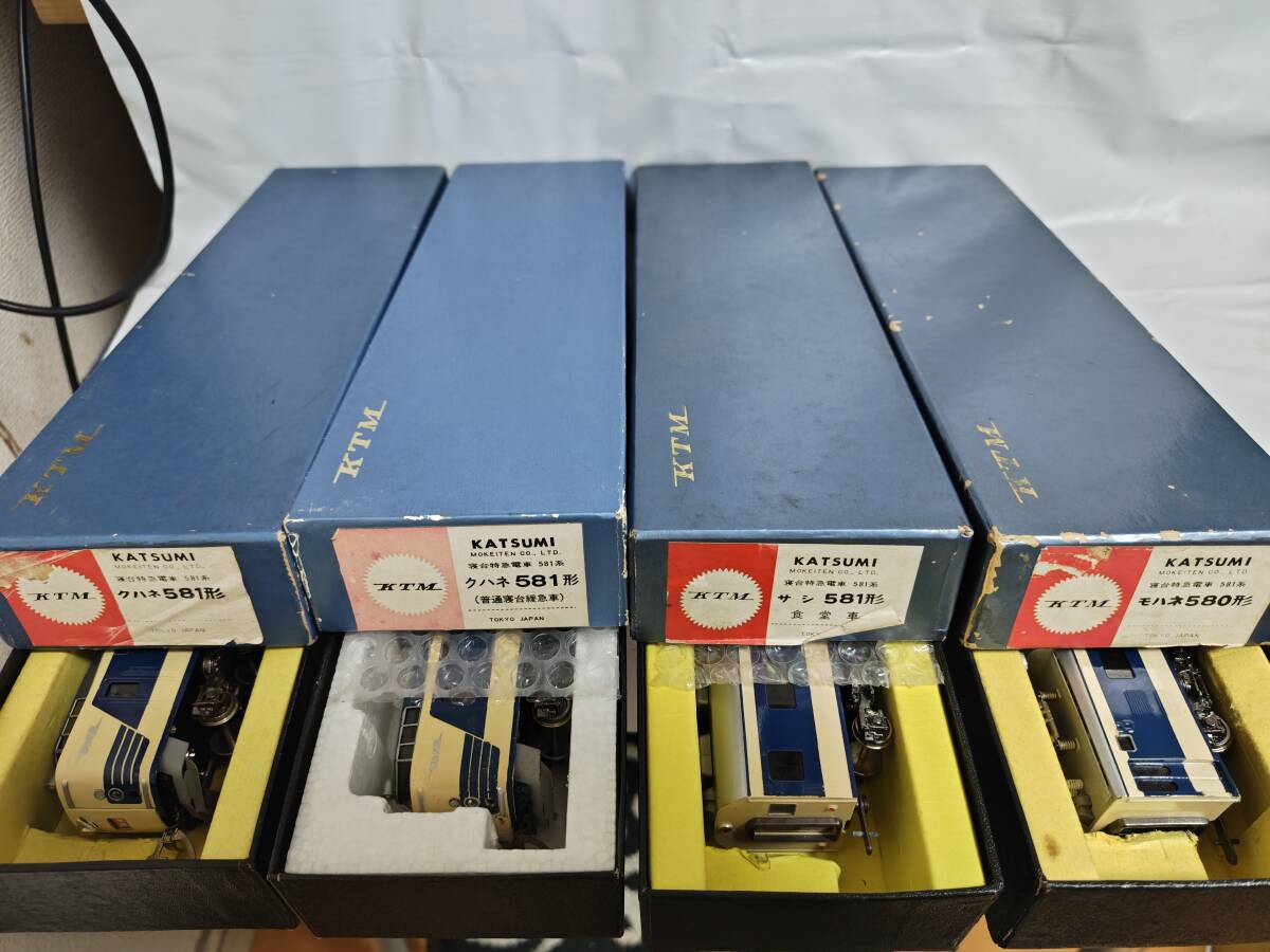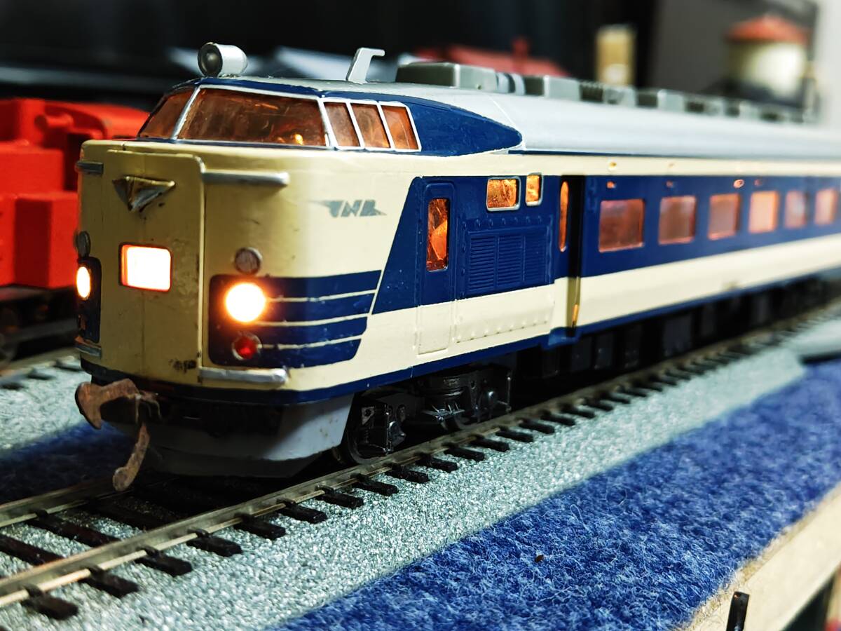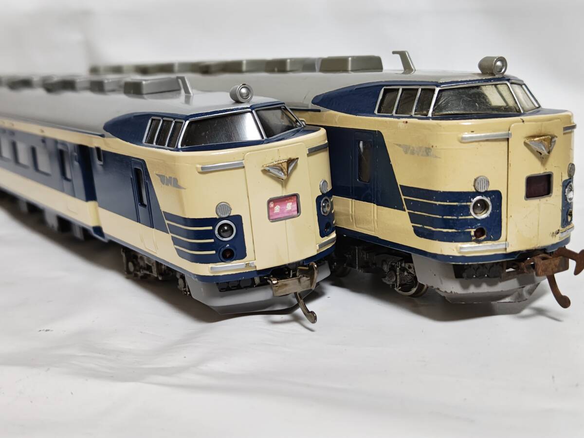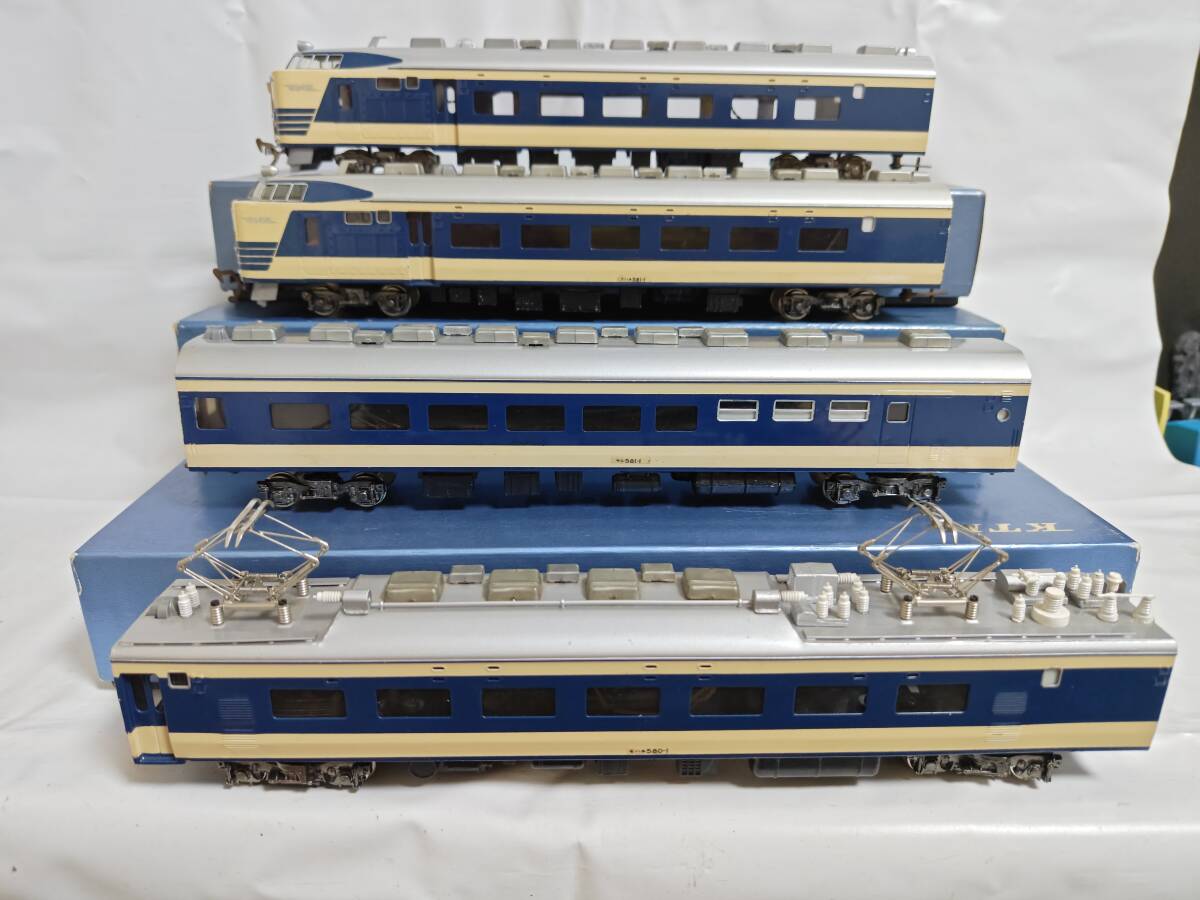 経年の割には4両ともに外観は良い方かと思います。クハネ581は「金星」「月光」のプレートが入っており、前照灯尾灯の点灯切り替え正常で室内灯も2個ともに点灯します。中間車の2両も室内灯はそれぞれ2個ともに点灯します。モハネは今のところ前後ともにスムーズに走行します。枚数の関係で床下の写真がありませんが、見る限り欠損はなくきれいな状態です(床下機器はプラでなく金属製のようです)。古い物ですのでNCNRにてお願いします。商品の発送はヤマト運輸宅急便着払いのみの扱いですからご注意ください(発払いや他社便は扱いかねます)。80サイズを予定してます。