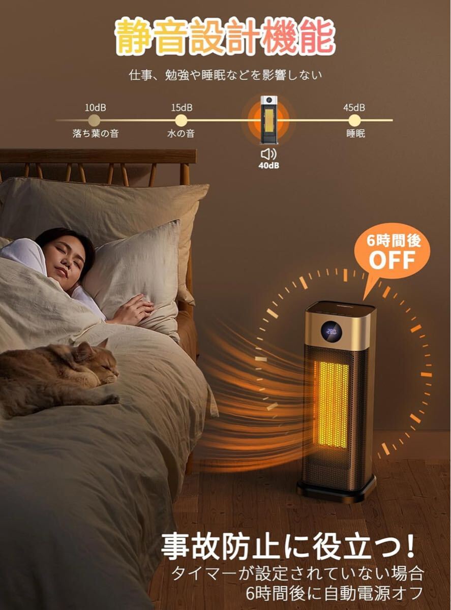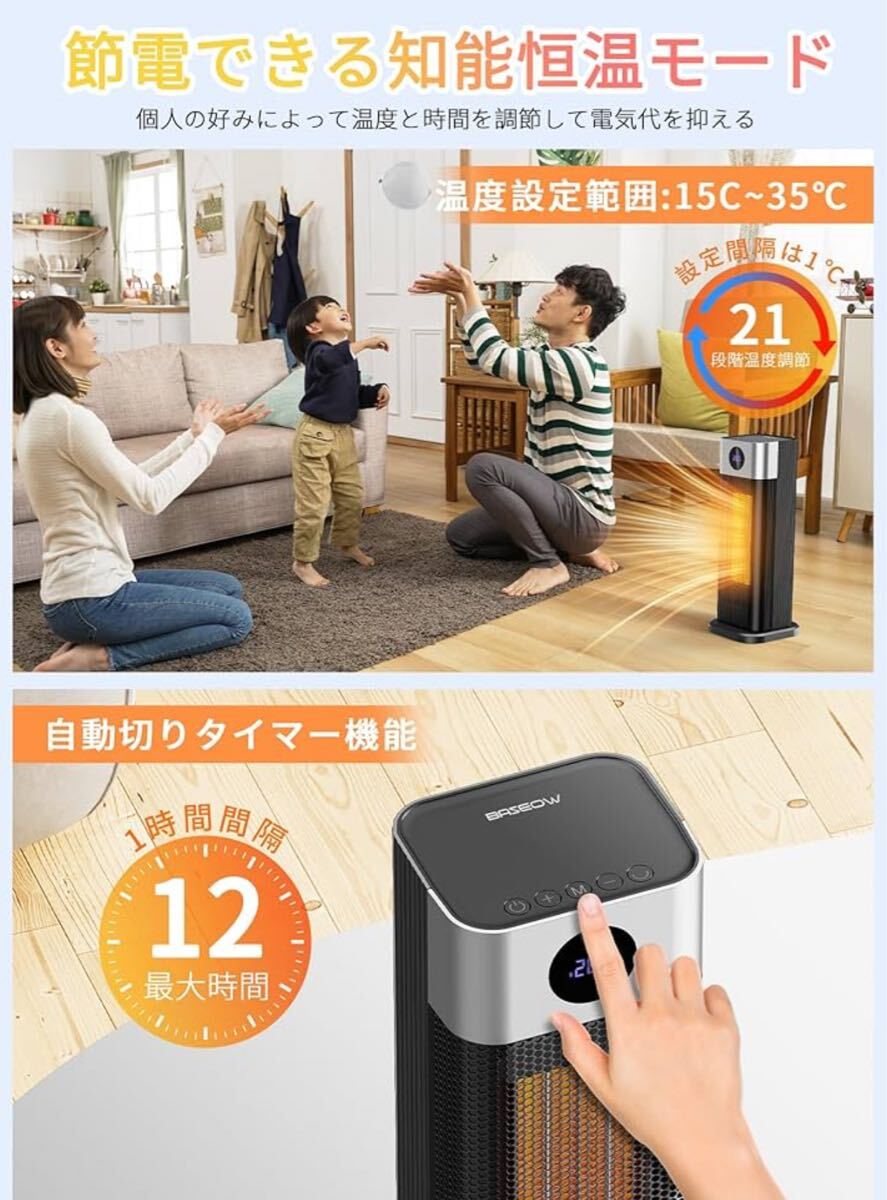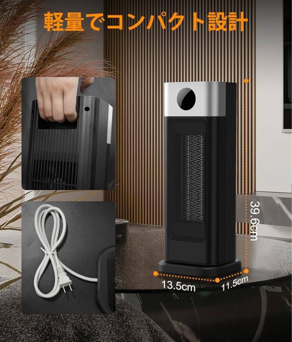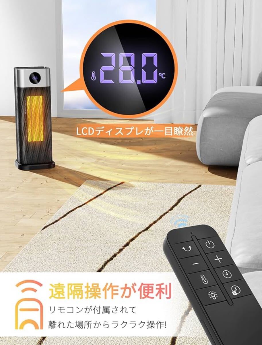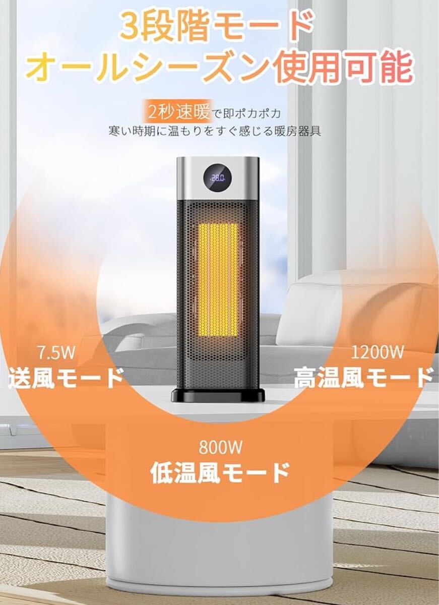 【2秒速暖、暖房範囲が広い】広範囲に2秒で素早く温かい風を送れることです。最大1200W高出力で風力が強いため、10畳以上の部屋を効率よく暖めます。自動首振りで足元を広く暖められるので、本体から離れた位置でも暖かさを感じやすいです。