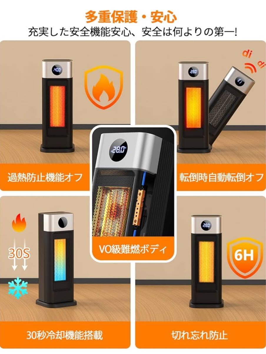 【多重保護装置】転倒OFF:小さい子どもやペットのいる家庭には、蹴って倒れてしまっても、自動で電源がオフになるため、火災や火傷を防止できます。過熱防止装置:温度センサーが室内温度の上昇を感知して、一定温度を超えると電源を自動でオフにする機能のこと。切れ忘れ防止:切り忘れ防止6時間自動OFF機能。