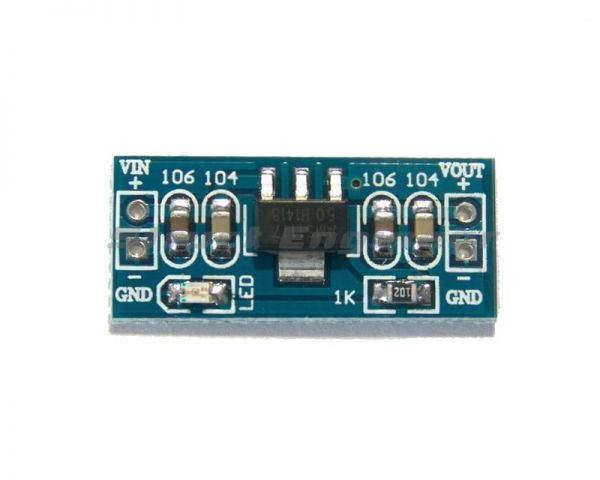 | 3端子電源レギュレーターAMS1117-5.0を使用した電源モジュールです。 入力電圧6.5~12Vを、5.0Vに降圧することができます。 25㎜×11㎜の極小サイズなので、基板上の組み込みなどに最適です。 電圧を加えると、LEDが点灯して通電状態が判ります。 付属のピンヘッダは、お好みに応じて半田付けしてご使用ください。 | |||||
