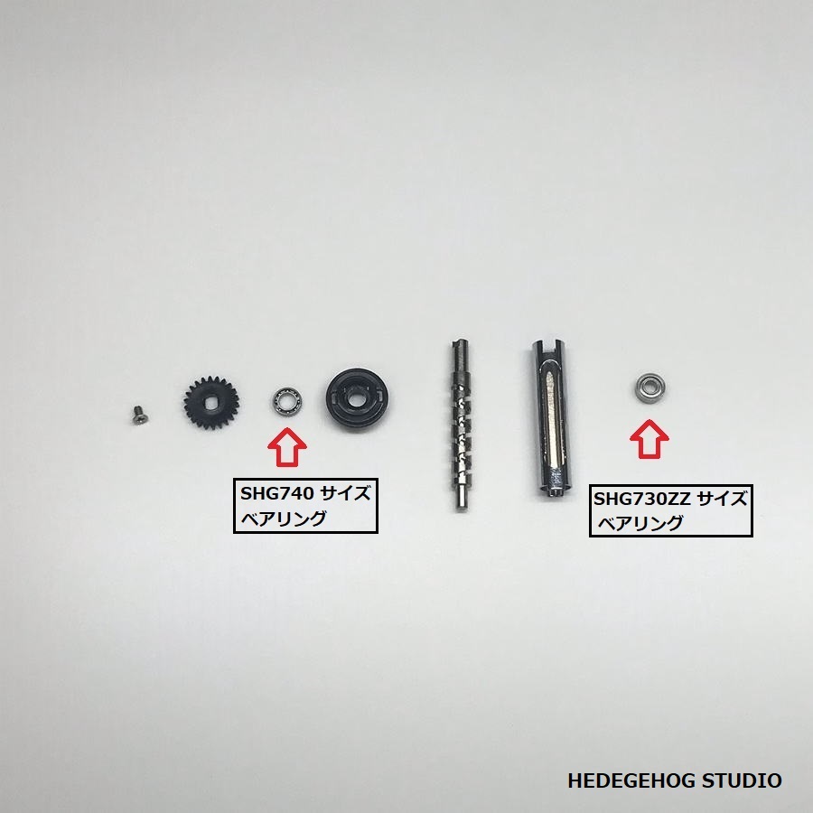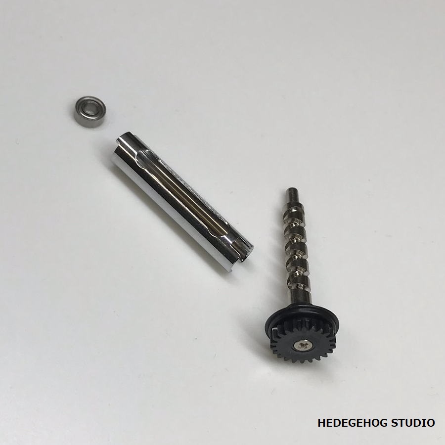 また、ギアは一体式のカシメ方式ではなく、+のビスによって固定されているので、分解清掃もボールベアリングへの注油も可能です。