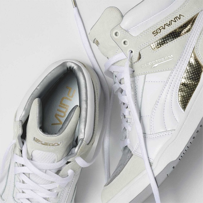 両サイドにはSORAYAMAのロゴがあしらわれたプーマストリップ、アッパー、クォーター、ヒールにはシルバーとゴールドの