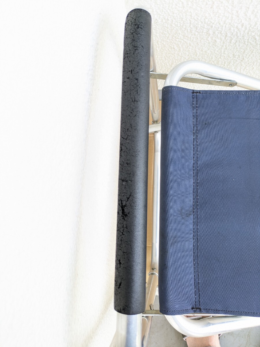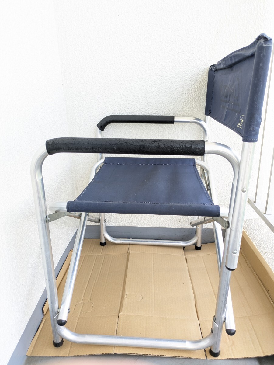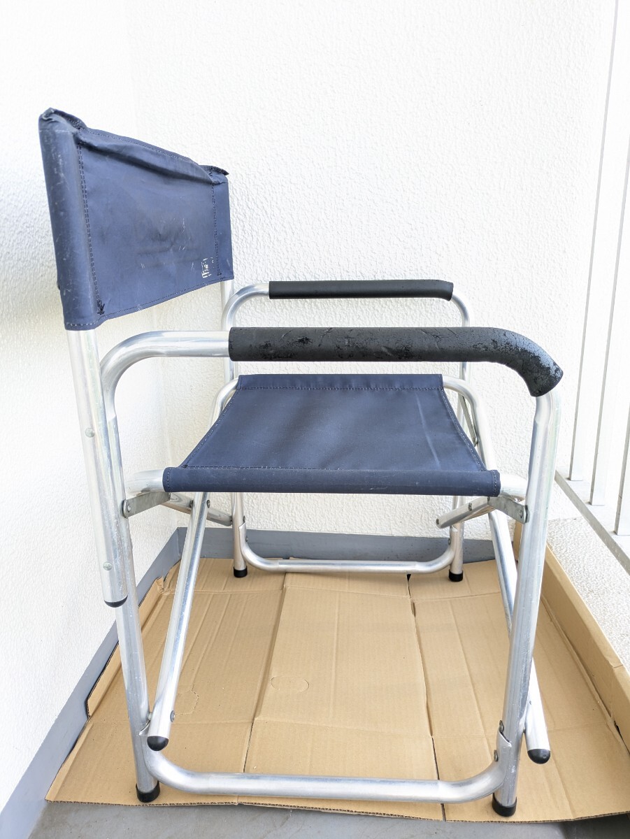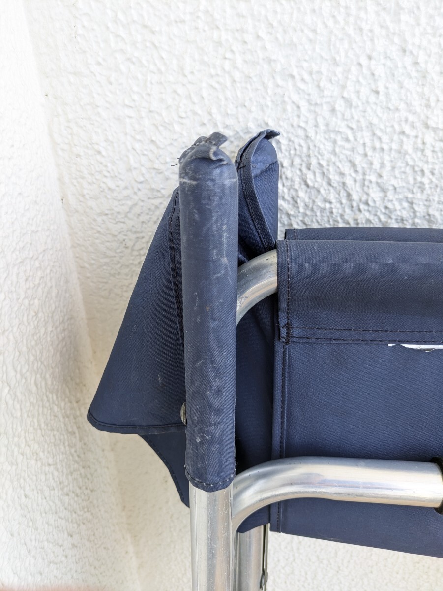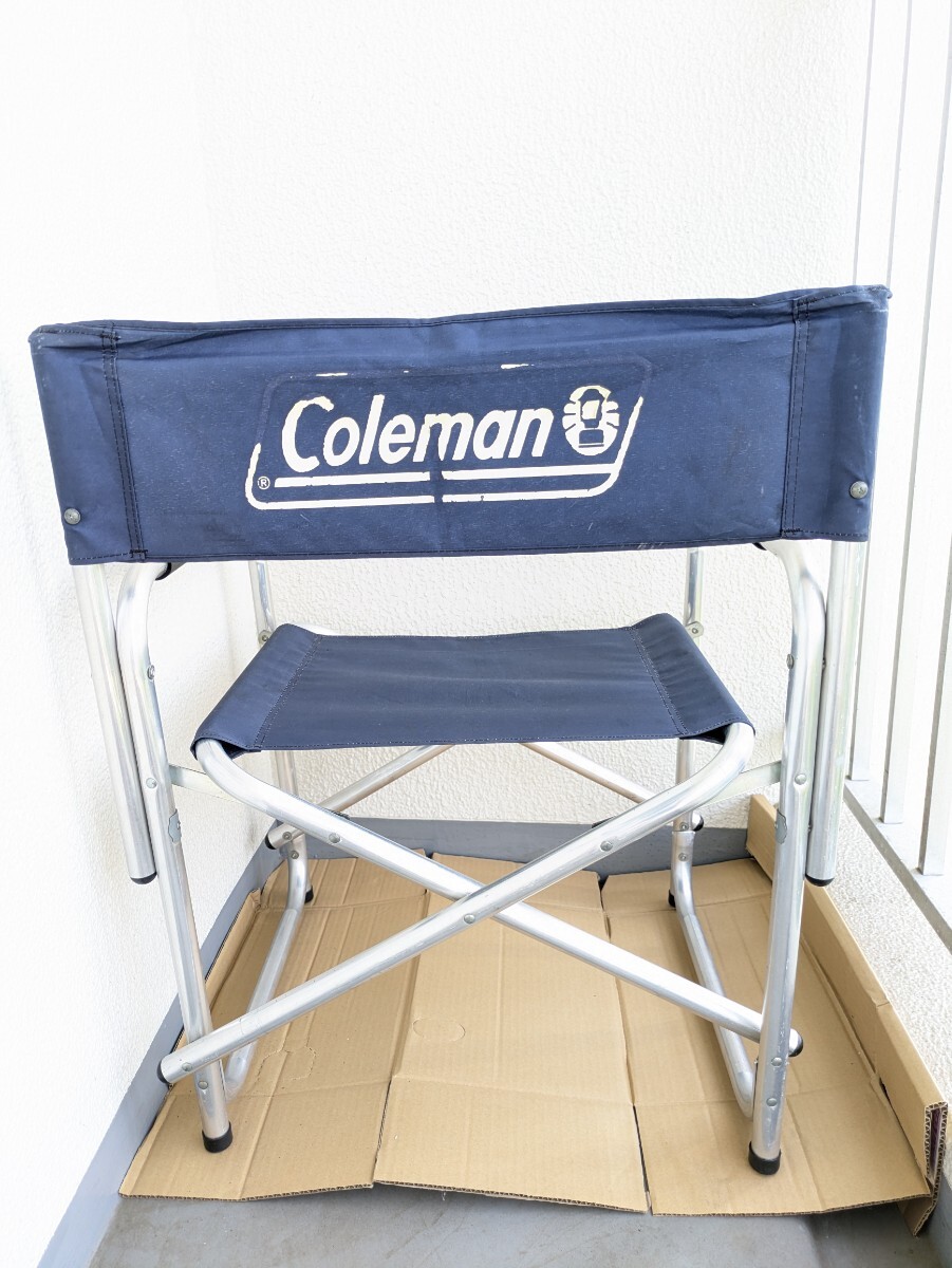 肘かけ部分のスポンジ、背中裏のColemanロゴのプリントが劣化しています。また右側肘かけのスポンジは少し前方へずれています。