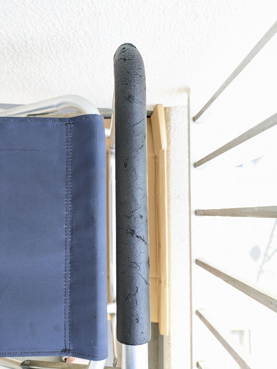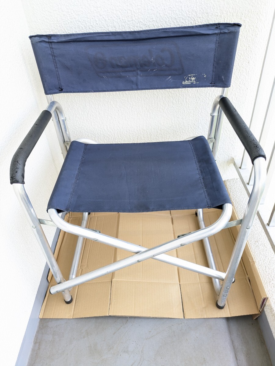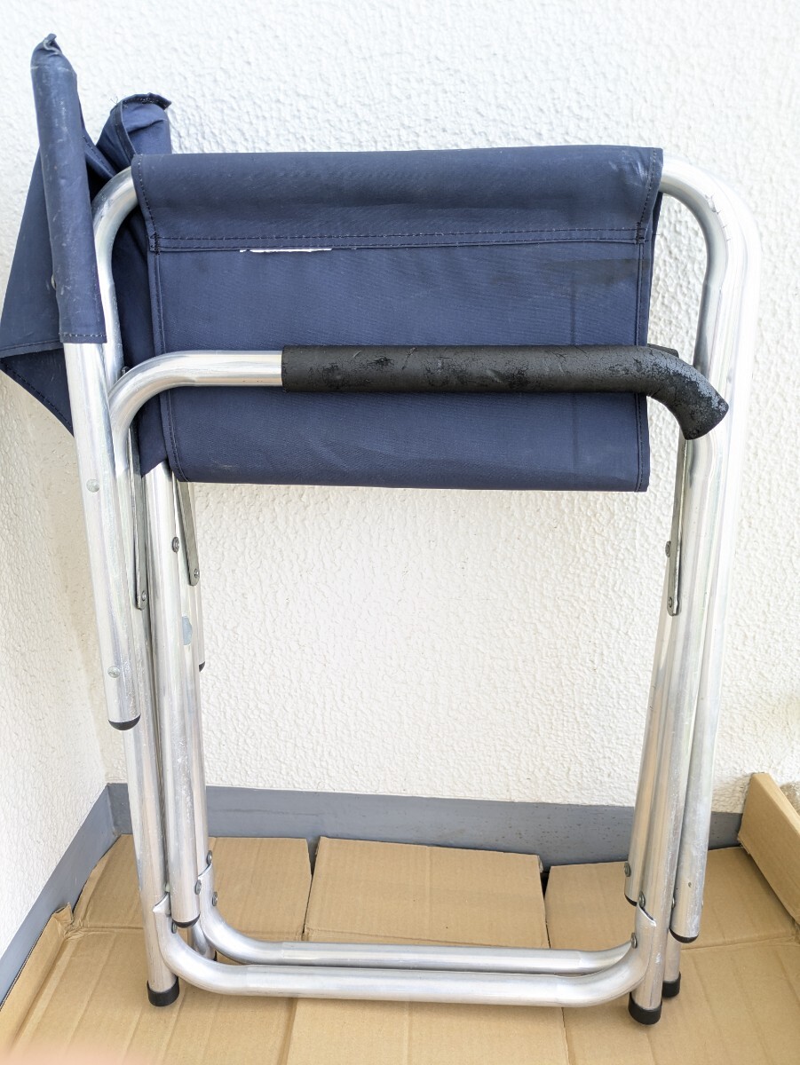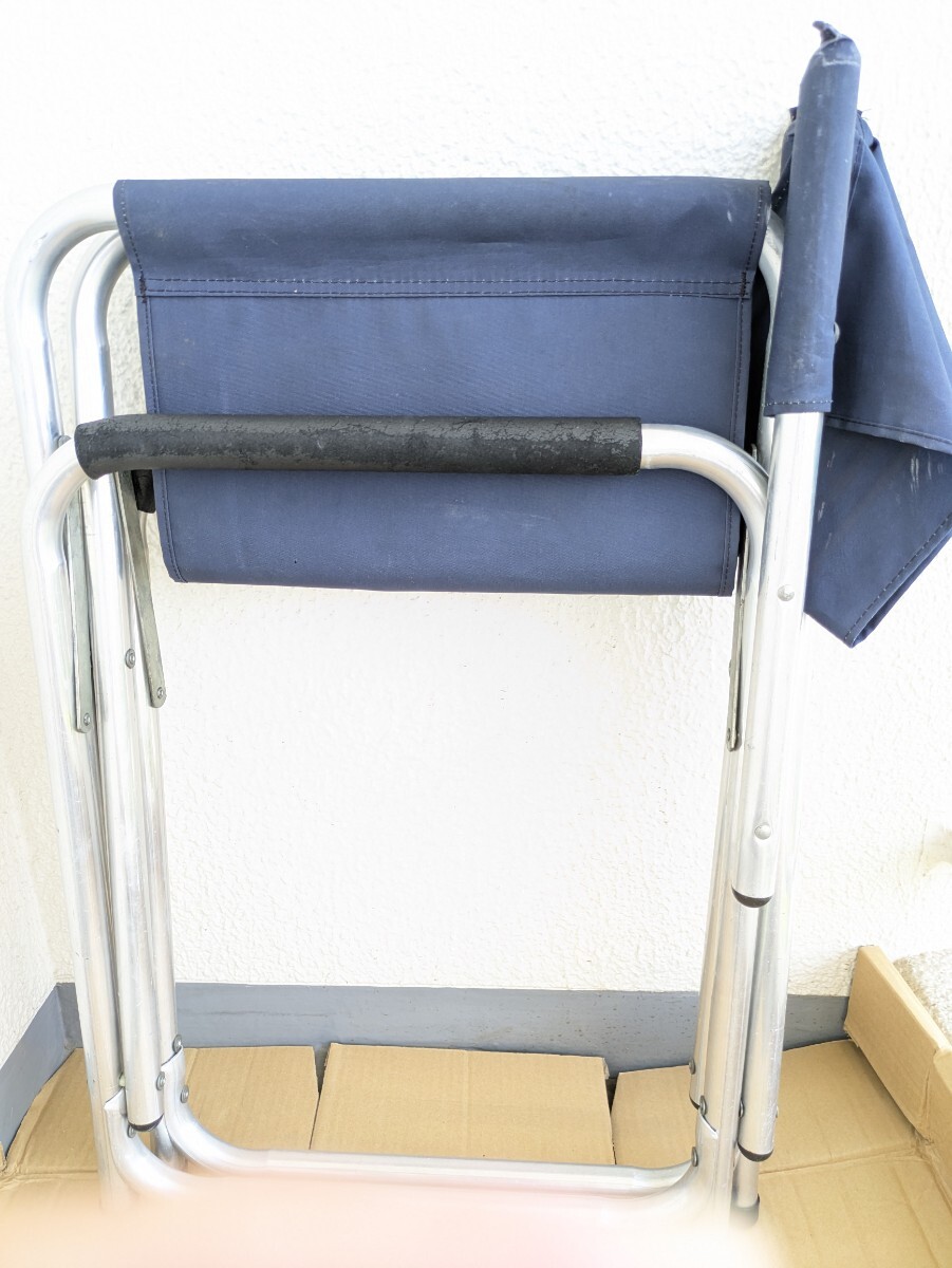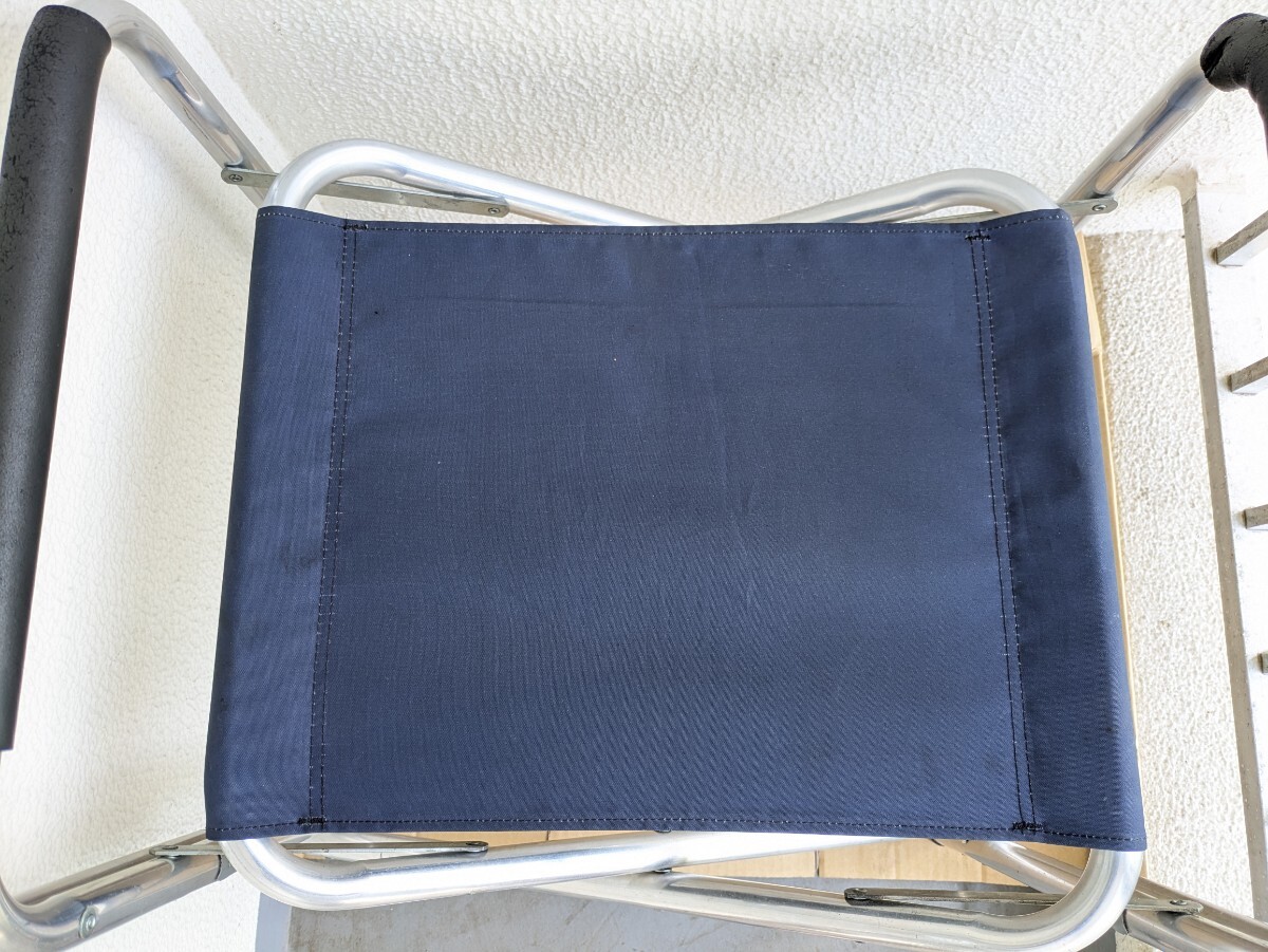 肘かけ部分のスポンジ、背中裏のColemanロゴのプリントが劣化しています。また右側肘かけのスポンジは少し前方へずれています。