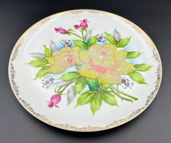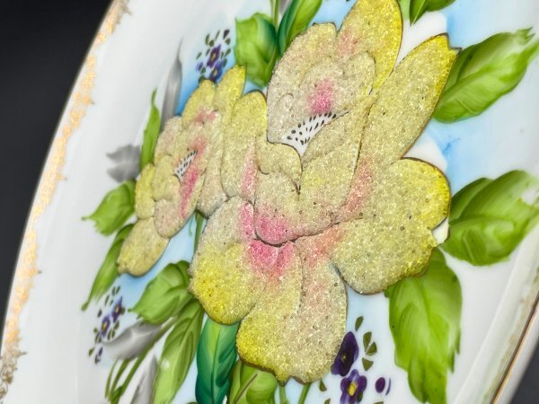 縁取りの豪華な金彩と、全面に広く施されたコラレン盛上げ技法による花文様が目を引きます。