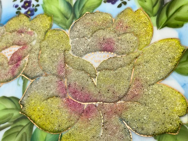 特に本作では、コラレン盛上げ技法を皿面全体に贅沢に用い、粒状ガラスの煌めきと立体感を存分に楽しめる仕上がりとなっています。