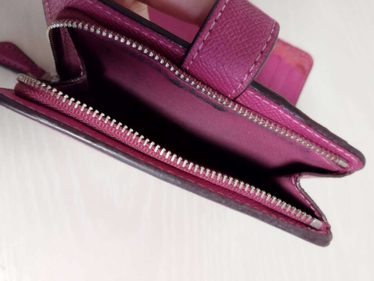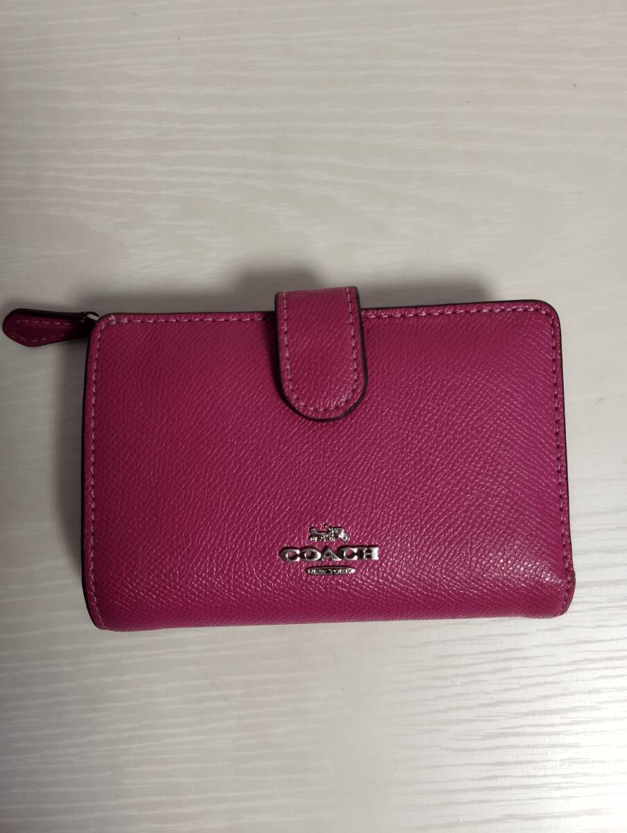 COACH(コーチ)の二つ折り革財布で、色は濃いピンクです。
