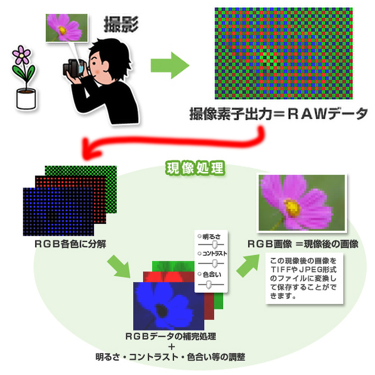 • 現像処理をカメラ内で行わず、撮像素子の情報をそのままファイルとして出力したものがRAWデータです。RAWファイルはRGB各チャンネルごとに12ビット4096諧調/チャンネル)=合計約687194万色として出力されたもので、JPEG画像に比べて大幅に広い階調を保持する画像となります。