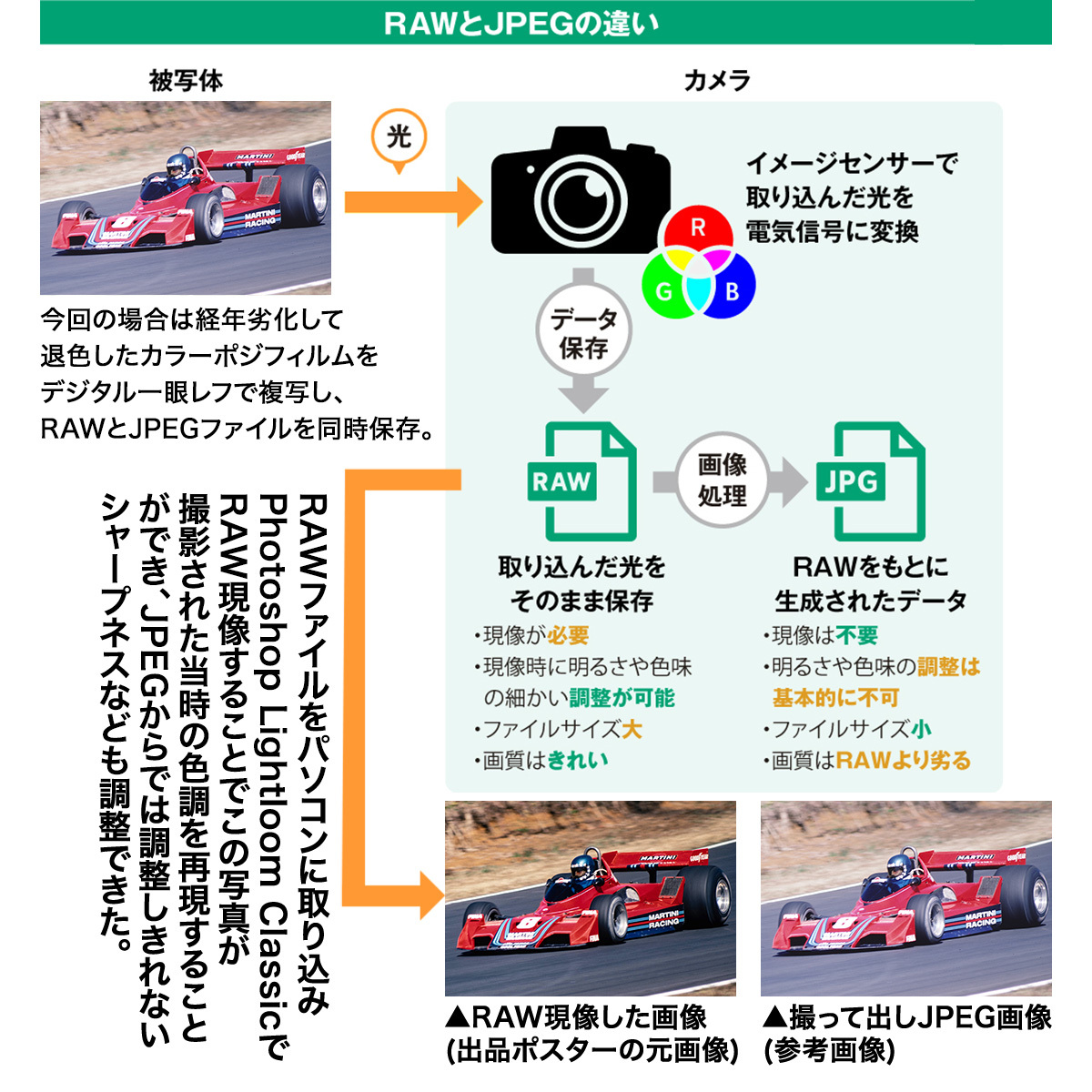 • 【画像1】(ポスターに使用する画像)と【画像2】(比較参考画像)ができる工程の違いを示す説明画像です。RAW現像した画像と、撮って出しのJPEG画像の違いがわかるようにしたつもりです。