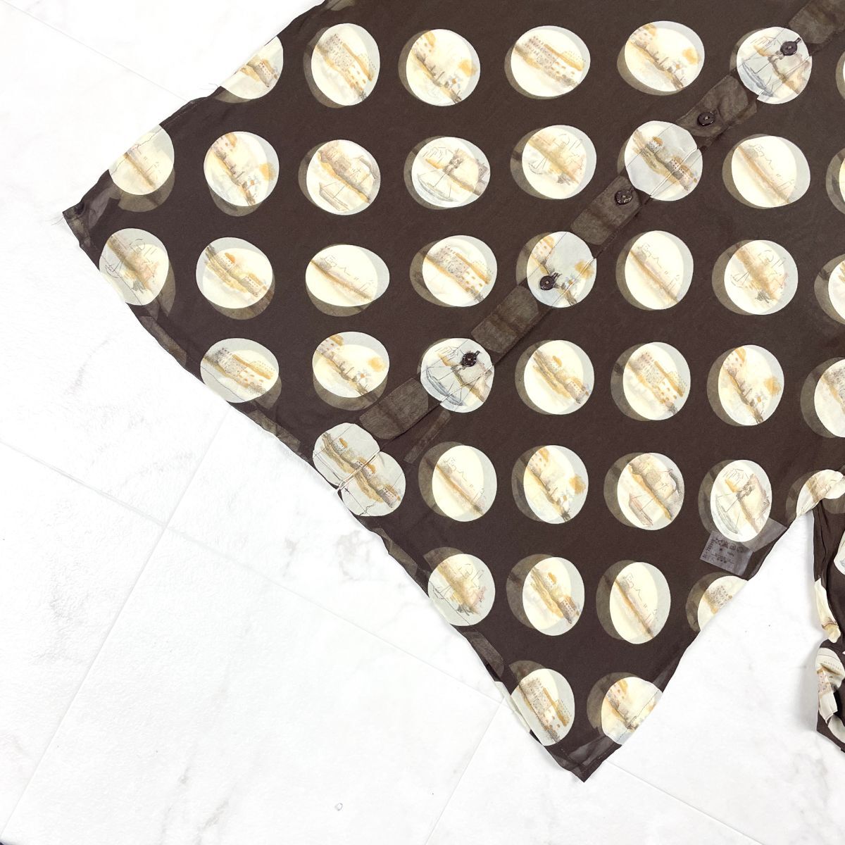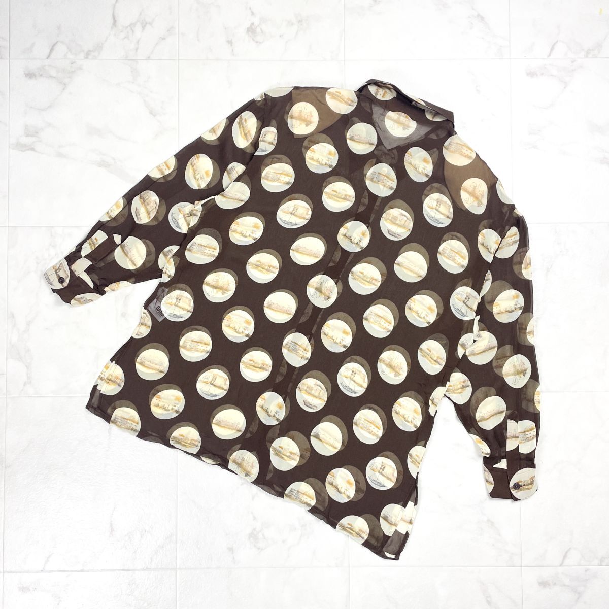 美品 DAKS LONDON ダックス シルク100%総柄シースルーシャツ 長袖ブラウス ドット柄 肩パッド付 レディース ブラウン 茶色 サイズ13*FD436