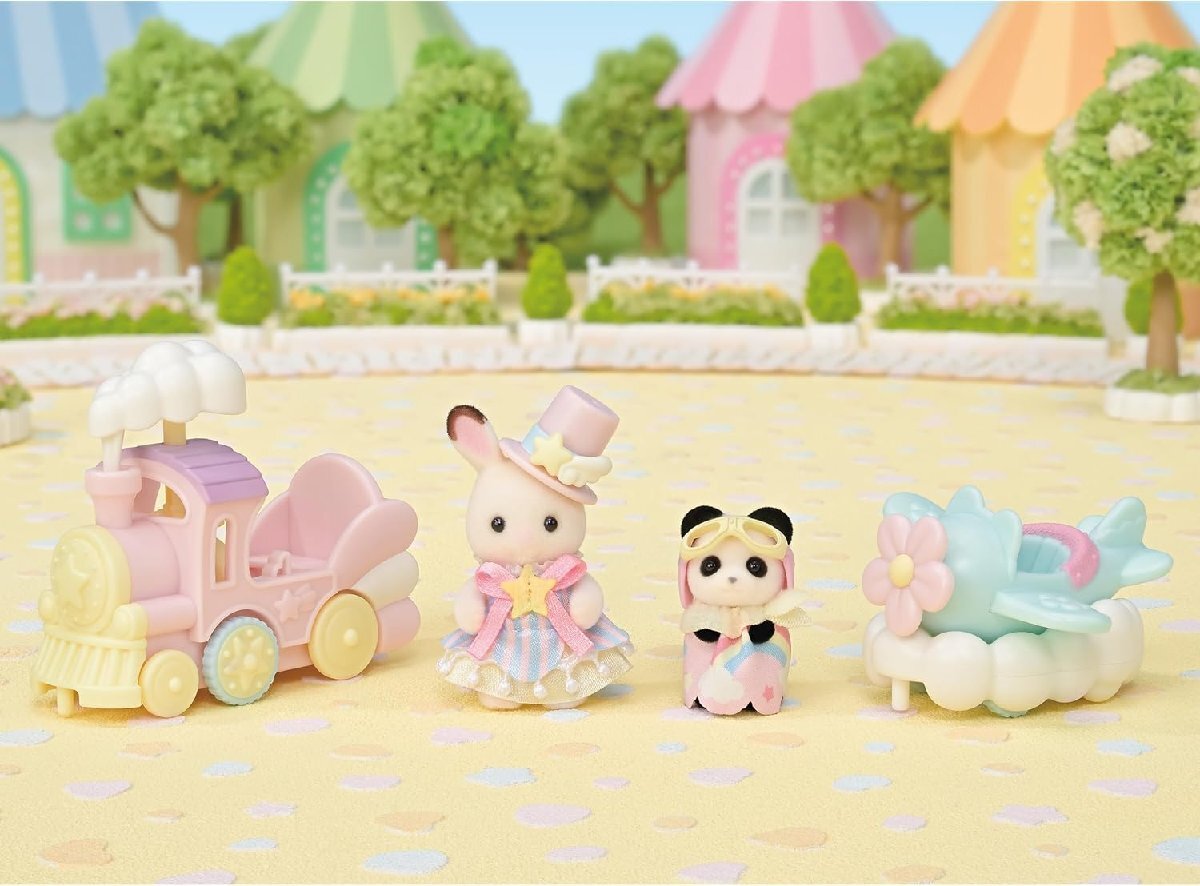 ショコラウサギの赤ちゃん、パンダの小さい赤ちゃん、汽車、ひこうき、帽子、ゴーグル